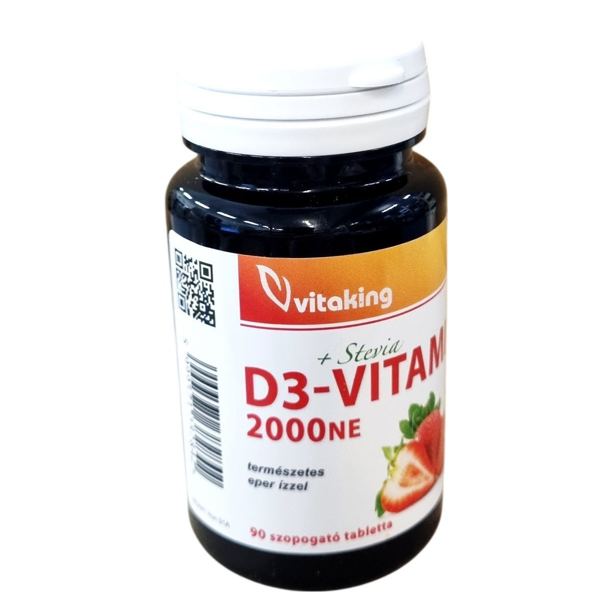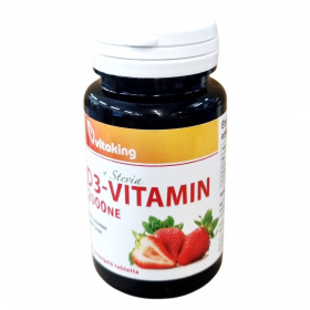 A Vitaking D3-vitamin 2000NE szopogató tabletta természetes eper ízzel készült, így könnyen fogyasztható. Egy tabletta 2000NE, azaz 50 µg D3-vitamint tartalmaz, amely a referencia beviteli érték 1000%-át fedezheti. A termék hozzájárulhat az egészséges csontozat, a normál fogazat és az izomfunkció fenntartásához, támogatja a vér normál kalciumszintjének fenntartását, valamint a kalcium és a foszfor normál felszívódását és hasznosulását. Emellett támogathatja az immunrendszer normál működését és szerepet játszhat a sejtosztódásban. Összetevői között szerepelnek természetes alapanyagok, mint a szárított eperlé és természetes eper aroma, valamint stevia kivonat mint édesítőszer. A termék csomósodást gátló és savanyúságot szabályozó anyagokat is tartalmaz, amelyek a tabletta minőségét biztosítják. A tabletták 90 darabos kiszerelésben érhetők el.
