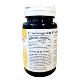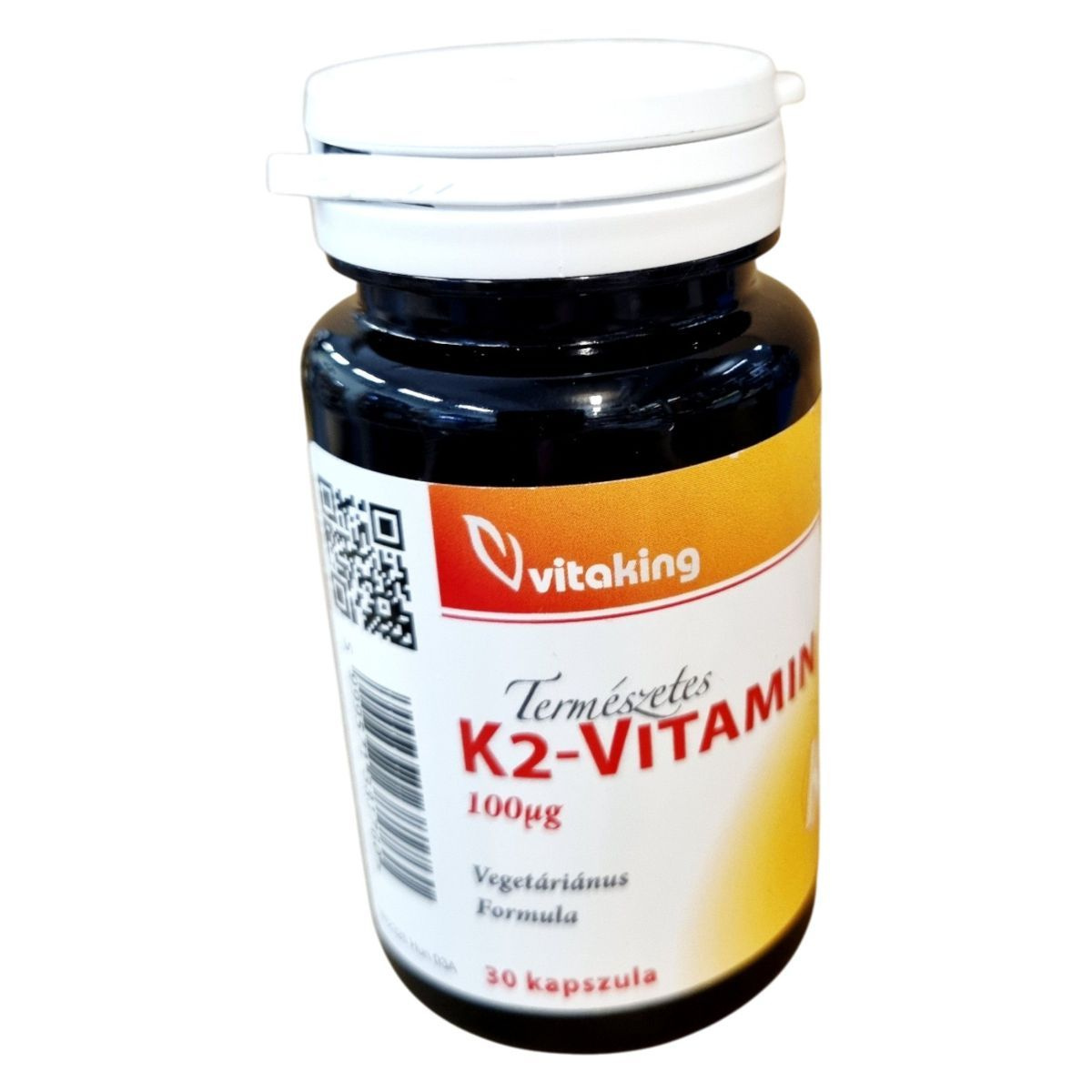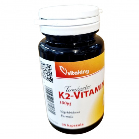 A Vitaking K2-vitamin étrend-kiegészítő 30 kapszulát tartalmaz, melyek mindegyike 100µg K2-vitamint biztosít. A termék vegetáriánus formula, amely a csontok egészségének támogatásához járulhat hozzá. A kapszulák menakinon („all trans” MK-7) formában tartalmazzák a K2-vitamint, amely a napi ajánlott beviteli érték 133,3%-át fedezheti. A termék összetevői között szerepelnek különböző tömegnövelő szerek és csomósodást gátló anyagok. A termék használata során fontos, hogy ne lépjük túl a napi ajánlott mennyiséget, és tartsuk be a tárolási előírásokat.