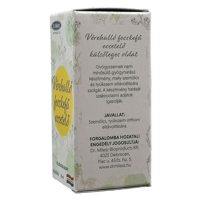 Gyógyszernek nem minősülő gyógyhatású készítmény, mely szemölcs és tyúkszem eltávolítására szolgál. A hatást szakirodalmi adatok igazolják. Mi a hatóanyaga? 30 ml kivonat 3 g vérehulló fecskefű hajtásrészének alkoholos kivonatát tartalmazza. Mit tartalmaz még a készítmény? Segédanyagként a készítmény 40 tf %-os alkoholt tartalmaz.