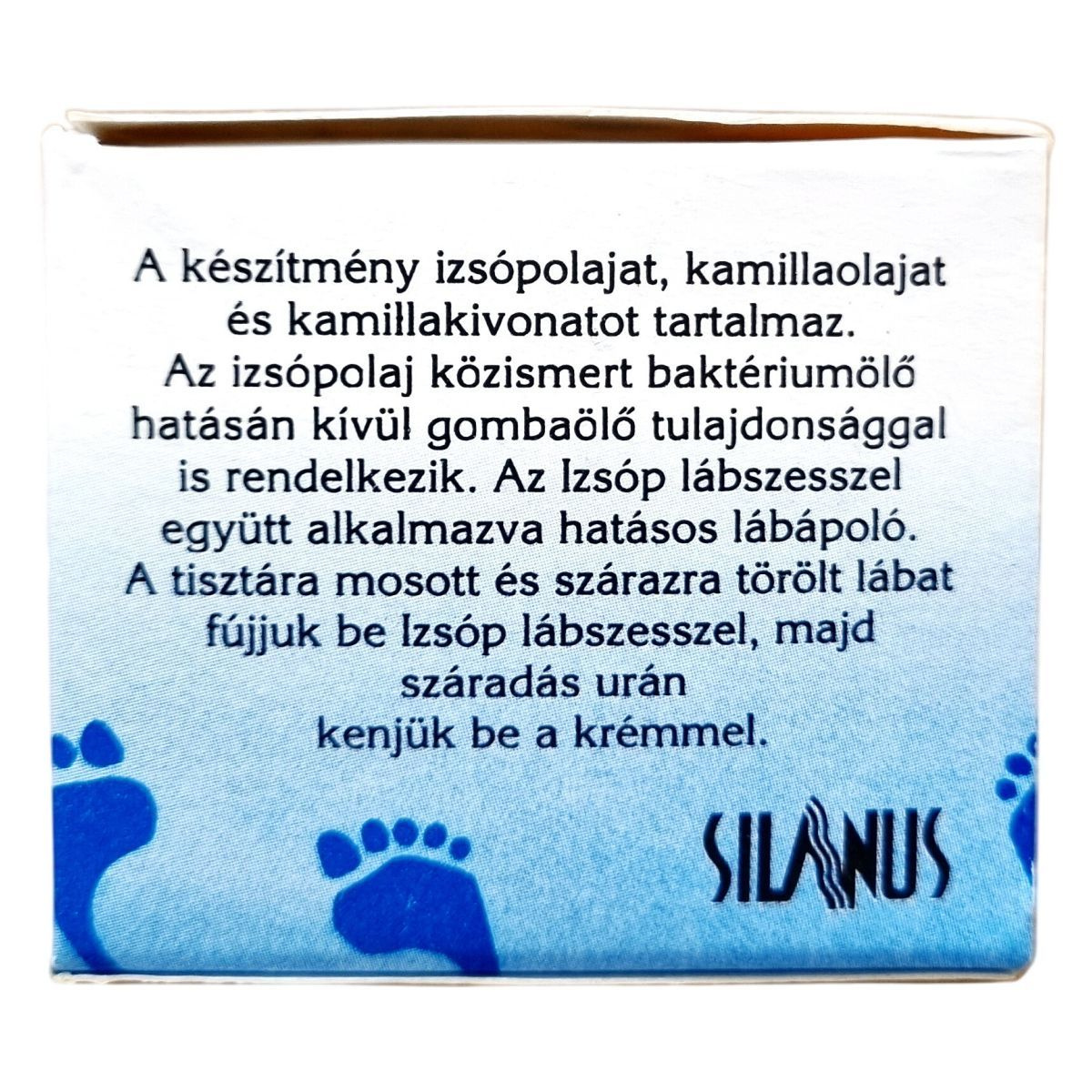 A Silanus Izsóp Lábkrém izsópolajjal és kamilla kivonatokkal segíti a lábápolást baktérium- és gombaölő hatásával, frissítő érzést nyújtva.