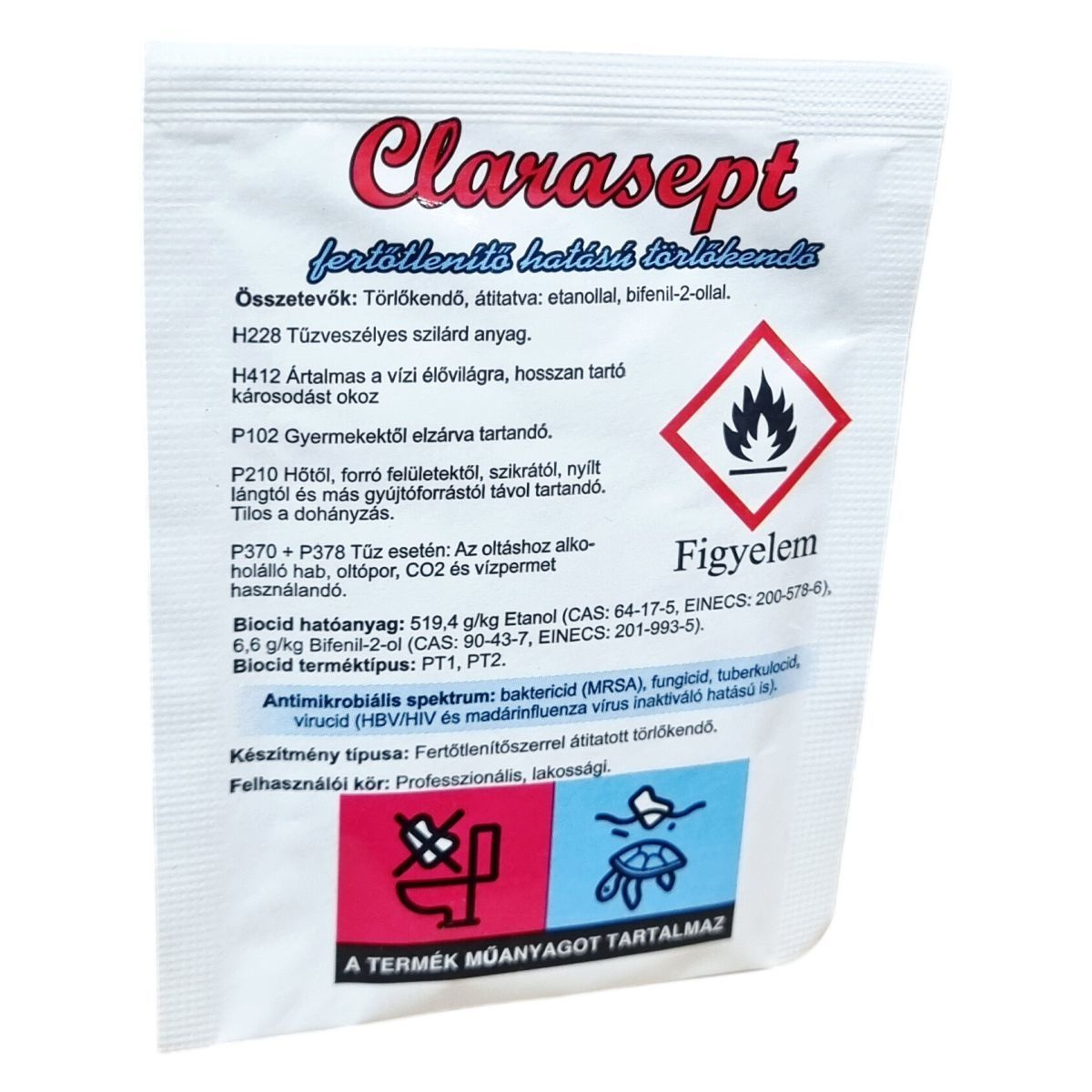 A Clarasept fertőtlenítő törlőkendő biocid terméktípus szerint PT1 és PT2-es készítmény, mely baktericid, fungicid, tuberkulocid, valamint virucid hatású, ideértve az HBV/HIV és madárinfluenza vírus inaktiválását is. A termék alkohol és bifenil-2-ol hatóanyaga révén hatékonyan alkalmas higiénés kézfertőtlenítésre, valamint eszközök és különböző felületek egyszerű és gyors fertőtlenítésére. Használata során nem szükséges víz alkalmazása, így praktikus megoldást nyújt szaniter helyiségekben vagy forgalmas közintézményekben. Elsősegély esetén, ha szembe kerül, a szemet langyos folyó vízzel legalább 5 percig ki kell öblíteni, és szükség esetén orvosi segítséget kell kérni. A készítmény műanyagot tartalmaz, ezért használat után a hulladékot megfelelően kell kezelni, nem juttatható élővízbe, közcsatornába vagy talajba. Kizárólag az eredeti, bontatlan csomagolásban, száraz, hűvös helyen őrizze meg hatékonyságát.