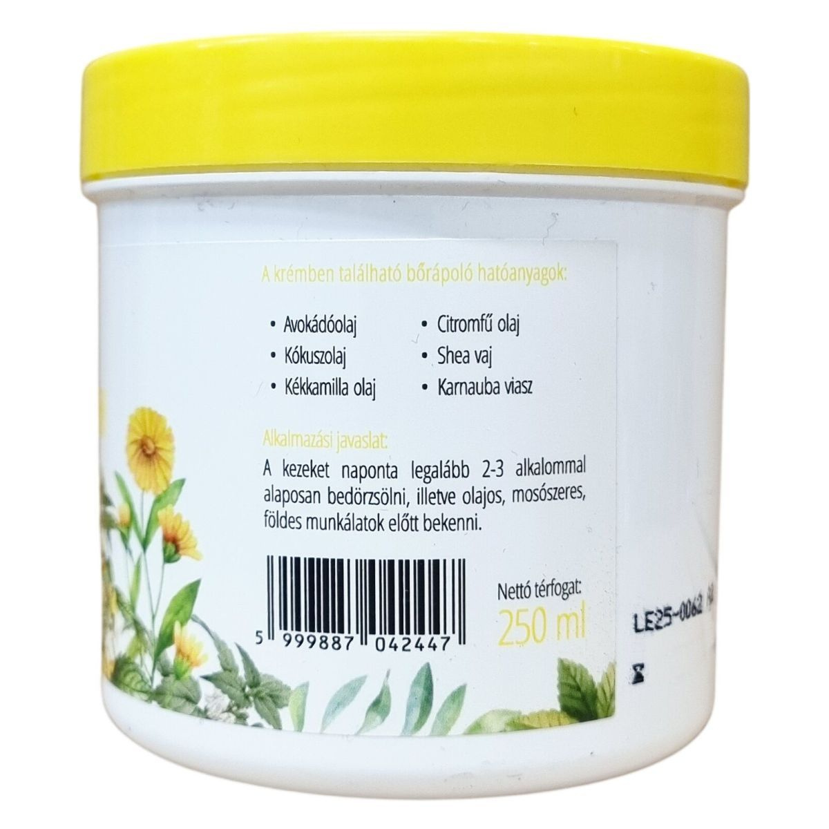 Ez a családi kézkrém különféle természetes és bőrápoló hatóanyagokat tartalmaz, például avokádóolajat, citromfű olajat, kókuszolajat, shea vajat, kékkamilla olajat és karnauba viaszt, amelyek együtt ápolják és védik a bőrt. A krém használata ajánlott naponta többször, különösen kézmosás vagy különféle munkafolyamatok, mint olajos, mosószeres vagy földes munkák előtt. A termék 250 ml-es kiszerelésű, gyártási azonosítóval ellátott, az összetevők listája a dobozon megtalálható. A krém Európai Unióban készült, a felelős forgalmazó a NaturComfort Kft., székhelye Nyíregyházán található.