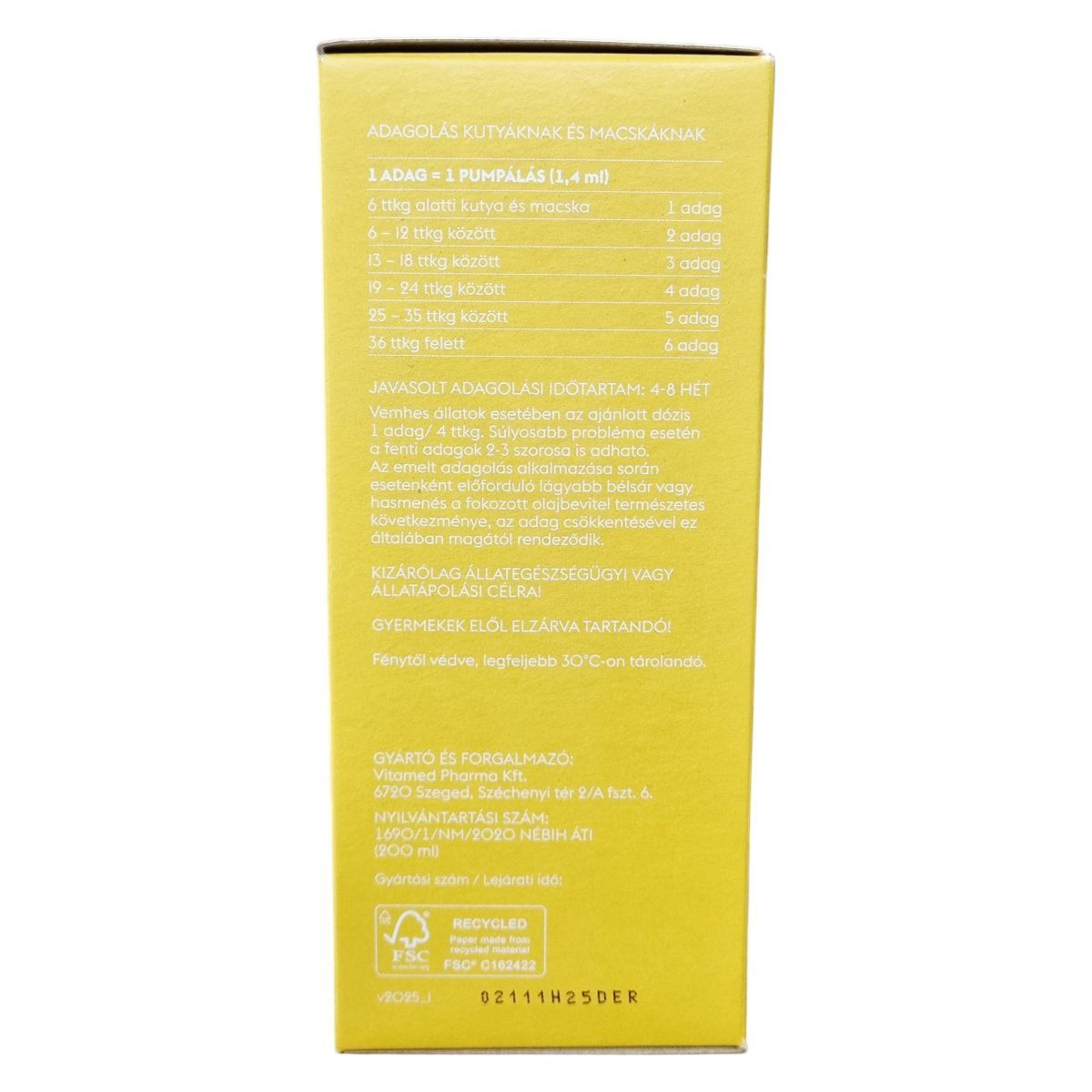 A Dermato bőrtápláló olaj egy állatgyógyászati gyógyhatású készítmény kutyák és macskák számára, amely létfontosságú omega-6 és omega-3 zsírsavakat optimális, 5:1 arányban tartalmaz, hogy támogassa a bőr, szőrzet és karmok egészségét. Kiegészíti ezt koenzim Q10-gyel, ami nélkülözhetetlen a hámsejtek számára, valamint magas A-, D- és E-vitamin tartalommal, amelyek együttesen hozzájárulnak a bőr védelméhez és regenerálódásához. Az adagolási útmutató és a felhasználási javaslatok részletesen ismertetik, hogyan alkalmazható a készítmény különböző testsúlyú kutyák és macskák esetében, továbbá külön figyelmet kap a vemhes állatok dózisa is. A termék csak állategészségügyi vagy ápolási célra készült, és gyermekektől elzárva kell tartani. Környezettudatos csomagolás jellemzi, a papír FSC® tanúsítvánnyal rendelkezik.
