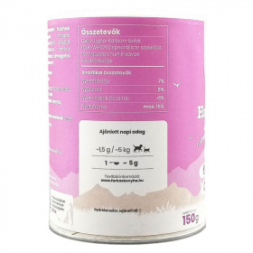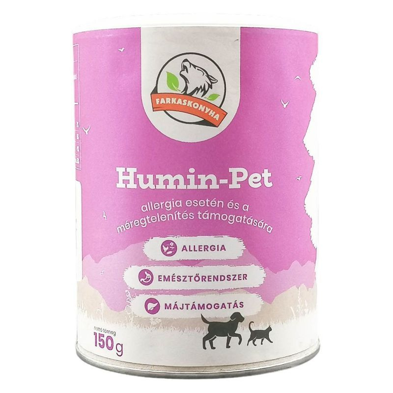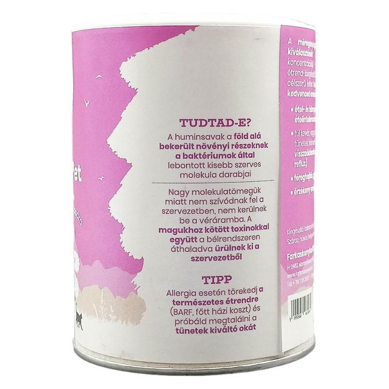 A méreganyagok, környezeti toxinok kiválasztását támogató, magas koncentrációjú huminsavakból készült étrend-kiegészítő. Élethelyzetek, amikor célszerű lehet huminsavakkal támogatni kedvenced emésztőrendszerét: étel- és környezeti allergia, ételintolerancia esetén, túl kevés, vagy túl sok gyomorsavra utaló tünetek felmerülésekor (étel visszaöklendezése, habos hányás, reflux), féreghajtás, gyógyszeres kezelések után, érzékeny emésztés esetén.Ajánlott napi adag: 1,5g/5kg. 1 mérőkanál kb. 5g.