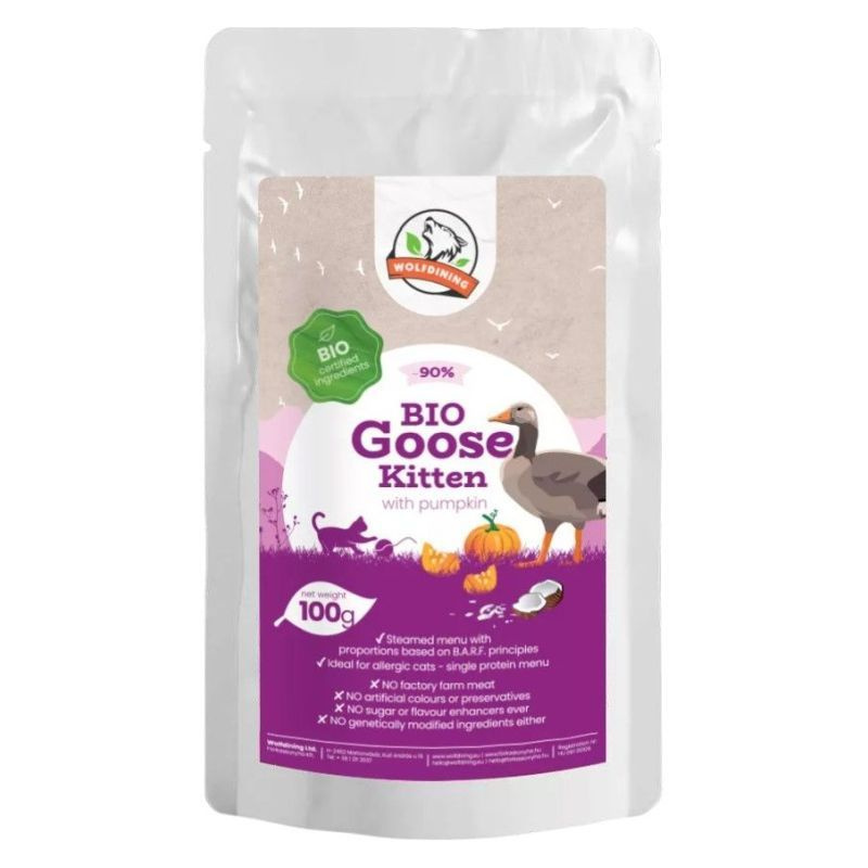 Teljes értékű menü kölyökmacskáknak. 90% bio liba sütőtökkel és kókuszpehellyel gazdagítva, megszórva bio lenmaggal és bio macskamentával. A BARF étrend alapelvei szerint készült.