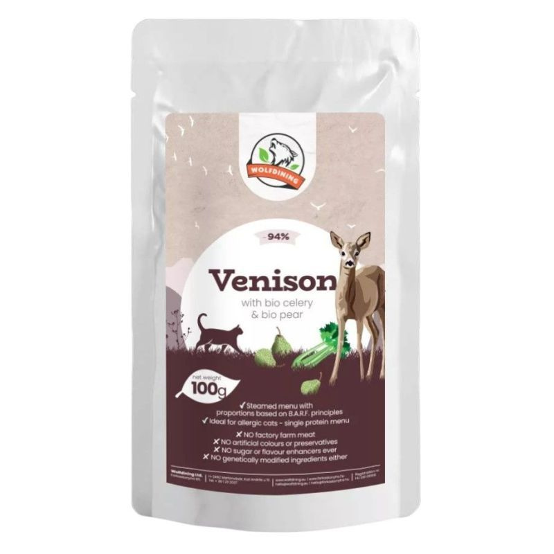 Teljes értékű menü felnőtt macskáknak. 94% őz bio zellerrel és bio körtével gazdagítva a BARF étrend alapelvei szerint készült.