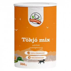 A Tökjó-Mix őszi-téli zöldségkeverékünk ~60% sütőtök, 25% cukkini és ~15% parajlevélből gondosan összeállított zöldség mix, aprítva. A sütőtök ásványi anyagokban gazdag: van benne kálcium, cink, folsav, mangán réz, remek immunerősítő a hidegebb hónapokban. Az édeskés íze miatt a kutyák imádják! A cukkini gazdag B és C vitaminban és ásványi anyagokban. A paraj gazdag A,B,C,E, K vitaminokban, magnézium, kálium réz, cink és mangánban. Hárman együtt isteni, egészséges, narancs és zöld színekben pompázó zöldségmixet alkotnak. BARF étrend esetén a ballasztanyagok biztosításához elengedhetetlenek a zöldségek. Ajánlott napi adag: 100gramm Tökjó Mix körülbelül 800gramm friss zöldségnek felel meg. Ha 100gramm zöldséget szeretnél adni kedvencednek, ~12 gramm Tökjó Mixre van hozzá szükséged. 1 evőkanál Tökjó Mix ~5gramm. A megadott napi mennyiség csak általános ajánlás, a napi ajánlott bevitel egyedenként eltérő lehet, függ kedvenced étrendjétől, aktivitásától, életkorától. Adagolás:: Áztasd be azonos mennyiségű langyos / meleg vízbe, és hagyd 15-30 percig ázni. Az emészthetőség további javítása érdekében egy botmixerrel pillanatok alatt tovább apríthatod a pelyheket. Mindig frissen áztatott zöldséget adj kedvencednek. Ha azt tapasztalod, hogy kedvenced nem szívesen eszi a zöldségeket, keverd el egy kis joghurttal, vagy esetleg mézzel, így sokkal ízletesebb, és még mindig nagyon egészséges. A kutyák, egészséges étrendjéhez a hús mellett hozzátartoznak a zöldségek is, hiszen ha vadon élnének, és lehetőségük lenne rá, megennék a zsákmányállataik gyomortartalmát is, amely nyilvánvalóan tartalmaz növényi eredetű összetevőket - zöldséget, gabonát is. A szárított zöldségeink úgy készülnek, hogy a zöldségekből alacsony hőmérsékleten történő szárítással kivonják a vizet. A víz elillan, megmarad viszont a zöldségek vitamin és ásványianyag tartalmának legnagyobb része. Vízelvonás hatására szerencsére nem változik meg a zöldség szerkezete, ezért víz hozzáadásával a szárított termékek újra az eredetit megközelítő állapotúak lesznek. A Tökjó-Mix zöldségei 3-6 mm méretre aprítva kerülnek a zacskókba, a könnyebb emészthetőség érdekében. Ezért válaszd: Gazdag vitamin és ásványianyag tartalmú. BARF étrend esetén a ballasztanyagok biztosításához elengedhetetlenek a zöldségek. Az édeskés íze miatt a kutyák imádják! Száraz, hűvös helyen, közvetlen napfénytől óvva tárold. Összetevők: szárított sütőtök, cukkini, parajlevél.