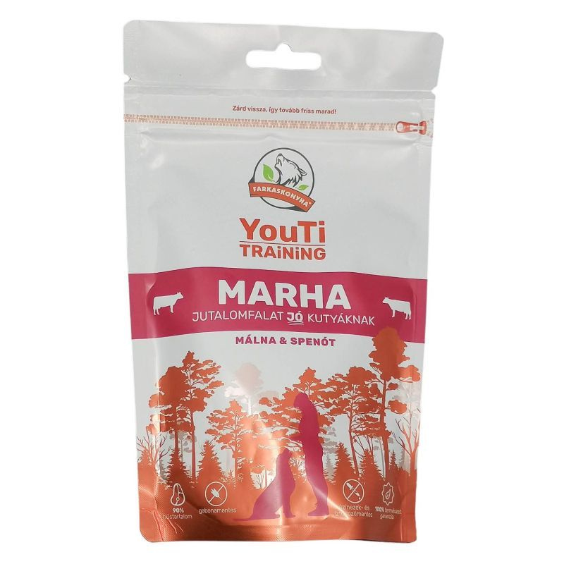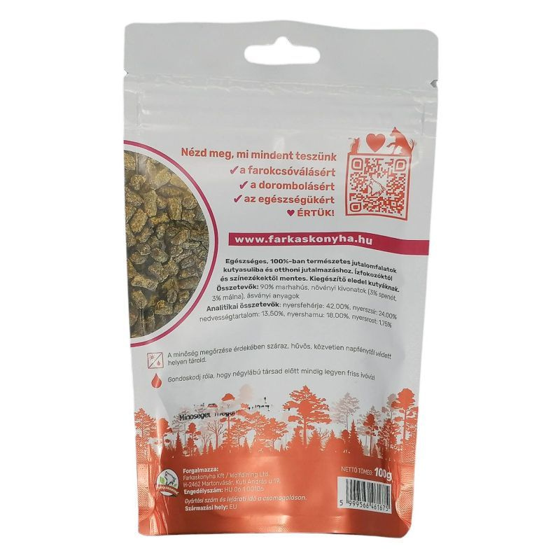90% marhahúsból készült, málna és spenóttal megspékelt tréning jutalomfalat, ideális otthonra jutalmazáshoz a mindennapokban és kutyasuliba is.