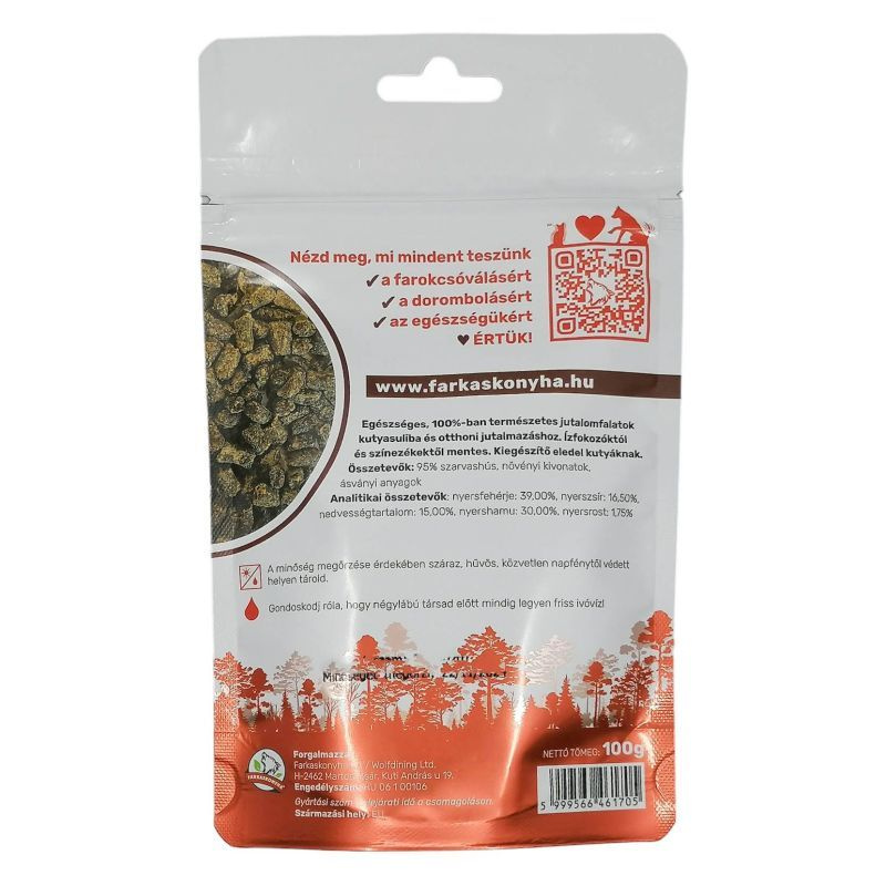 95% szarvashúsból készült tréning jutalomfalat, ideális otthonra jutalmazáshoz a mindennapokban és kutyasuliba is, a mini jutik óriási lelkesedést váltanak ki a kutyusokból.