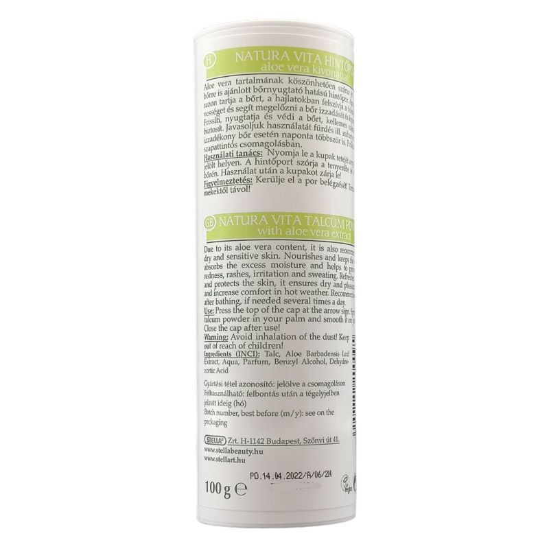 A természet ajándéka a megviselt, kiszáradt kéz bőrének és a fáradt lábak speciális ápolására. Fitoterápiás összetevőkben és hatóanyagokban gazdag kéz-, és lábápoló kozmetikum család. Aloe - vera tartalmának köszönhetően száraz és érzékeny bőrre is ajánlott bőrnyugtató hatású hintőpor. Ápolja és szárazon tartja a bőrt, a hajlatokban felszívja a felesleges nedvességet és segít megelőzni a bőr izzadását és kipirosodását.