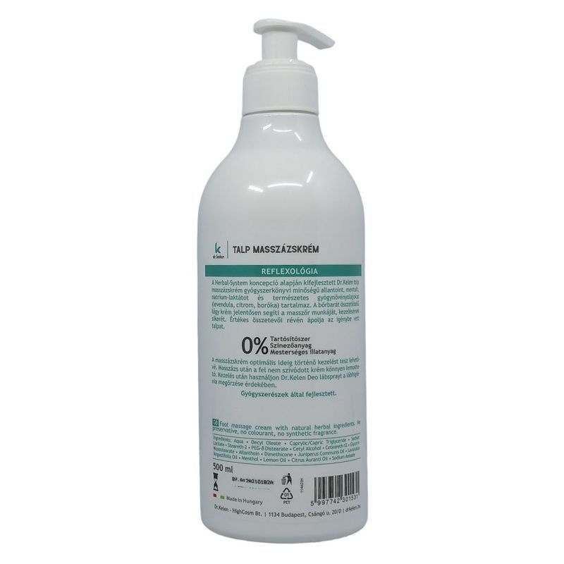 A Herbal-System koncepció alapján kifejlesztett Dr.Kelen talpmasszázs krém gyógyszerkönyvi minőségű allantoint, natrium-laktátot és természetes gyógynövényolajokat (levendula, citronella, citrom, boróka) tartalmaz. A bőrbarát összetételű lágy krém kiválóan segíti a masszőr munkáját, kezelésének sikerét. Értékes összetevői révén ápolja az igénybevett talpat.