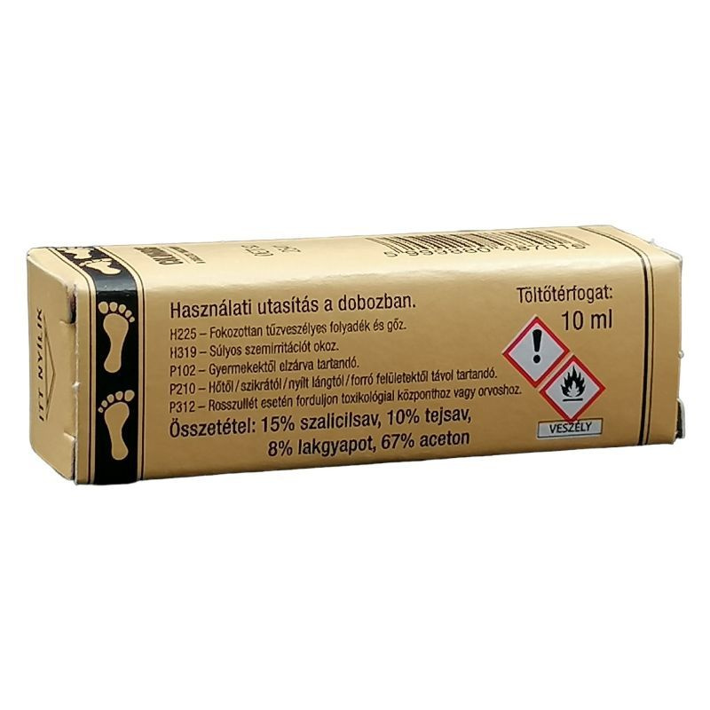 Használata: naponta kétszer, reggel és este használjuk a folyadékot. Mielőtt első ízben használnánk a szert, szükséges előtte 10-15 percig tartó meleg vizes lábfürdőzés illetve áztatás azon a testrészünkön, amit kezelni szeretnénk. A szárazra törölt testrészünkön a fiolában lévő folyadékból bekenjük a tyúkszemet, vigyázva arra, hogy csak a fájós megkeményedett bőrfelületre kerüljön, mert ha a környékére is jut a folyadékból, esetleg gyulladásba is hozhatja azt.