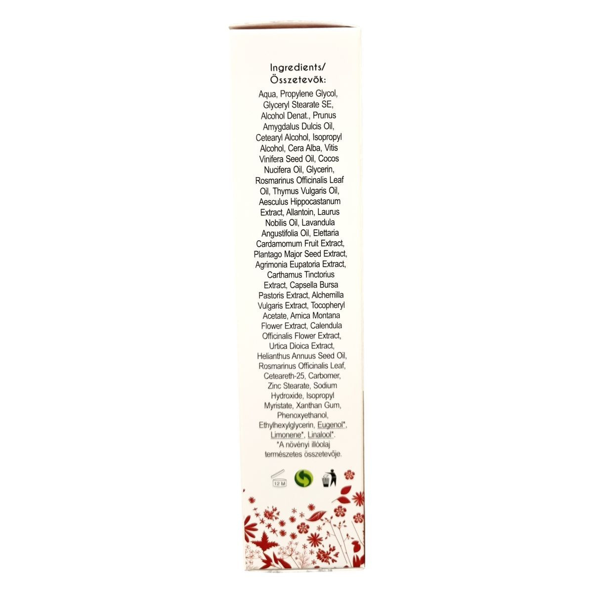 Vadgesztenye- és szőlőmagolaj-tartalmú krém növényi olajokkal és gyógynövény-kivonatokkal, fáradt, feszülő lábak és bőrfelület ápolására.