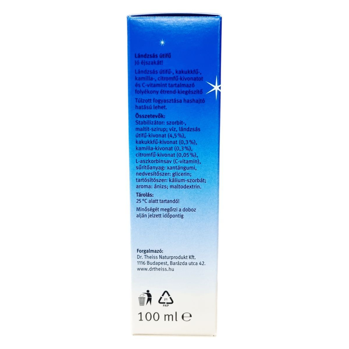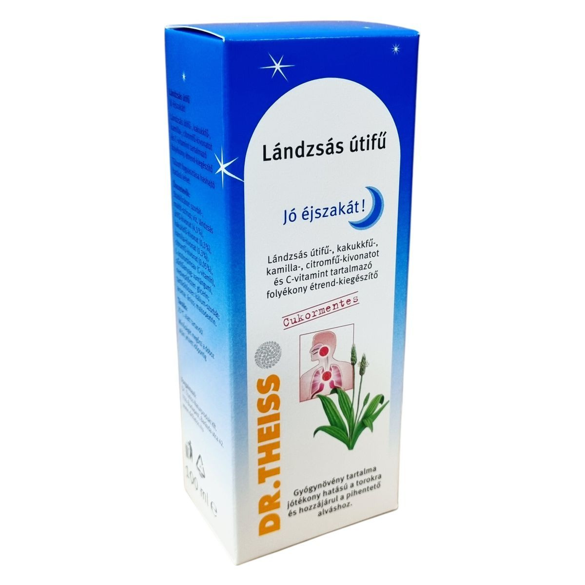 A Dr. Theiss Lándzsás útifű Jó éjszakát! folyékony étrend-kiegészítő lándzsás útifű-, kakukkfű-, kamilla-, citromfű-kivonatot és C-vitamint tartalmaz. A gyógynövénykivonatok jótékony hatásúak lehetnek a torokra, hozzájárulhatnak a pihentető alváshoz, valamint az őszi-téli meghűléses időszak kellemesebb átvészeléséhez. A lándzsás útifű-kivonat támogathatja a légúti rendszer egészségének megőrzését, míg a kamilla és citromfű elősegíthetik az éjszakai nyugalmat. A készítmény alkohol- és cukormentes, ezért cukorbetegek is fogyaszthatják. Jó ízű, így hígítás nélkül is fogyasztható, adagoló pohárka mellékelve. Túlzott fogyasztása hashajtó hatású lehet.