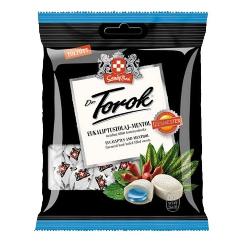 Eukaliptusz és mentol tartalmú töltött keménycukorka.