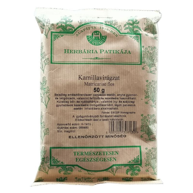 A kamillavirág (Matricaria chamomilla flos) az orvosi székfű szárított virágzata, amely illóolajokat (például bisabololt és kamazulént), flavonoidokat és egyéb bioaktív fitovegyületeket tartalmazó gyógynövényi drog. Gyulladásos folyamatokat moduláló, enyhe görcsoldó és nyálkahártya-védő hatásai révén hagyományosan emésztőrendszeri panaszok, felső légúti irritáció és bőrnyugtatás támogatására alkalmazzák. Mechanizmusa részben a ciklooxigenáz- és lipoxigenáz-útvonal befolyásolásán, valamint a simaizom-aktivitás mérséklésén alapulhat. Külsőleg alkalmazva hozzájárulhat a bőr regenerációjához. Megfelelő mennyiségben általában jól tolerálható, azonban fészkesvirágzatúakra érzékenyeknél allergiás reakció előfordulhat. Egyéni egészségügyi állapot vagy gyógyszerszedés esetén javasolt szakemberrel konzultálni.