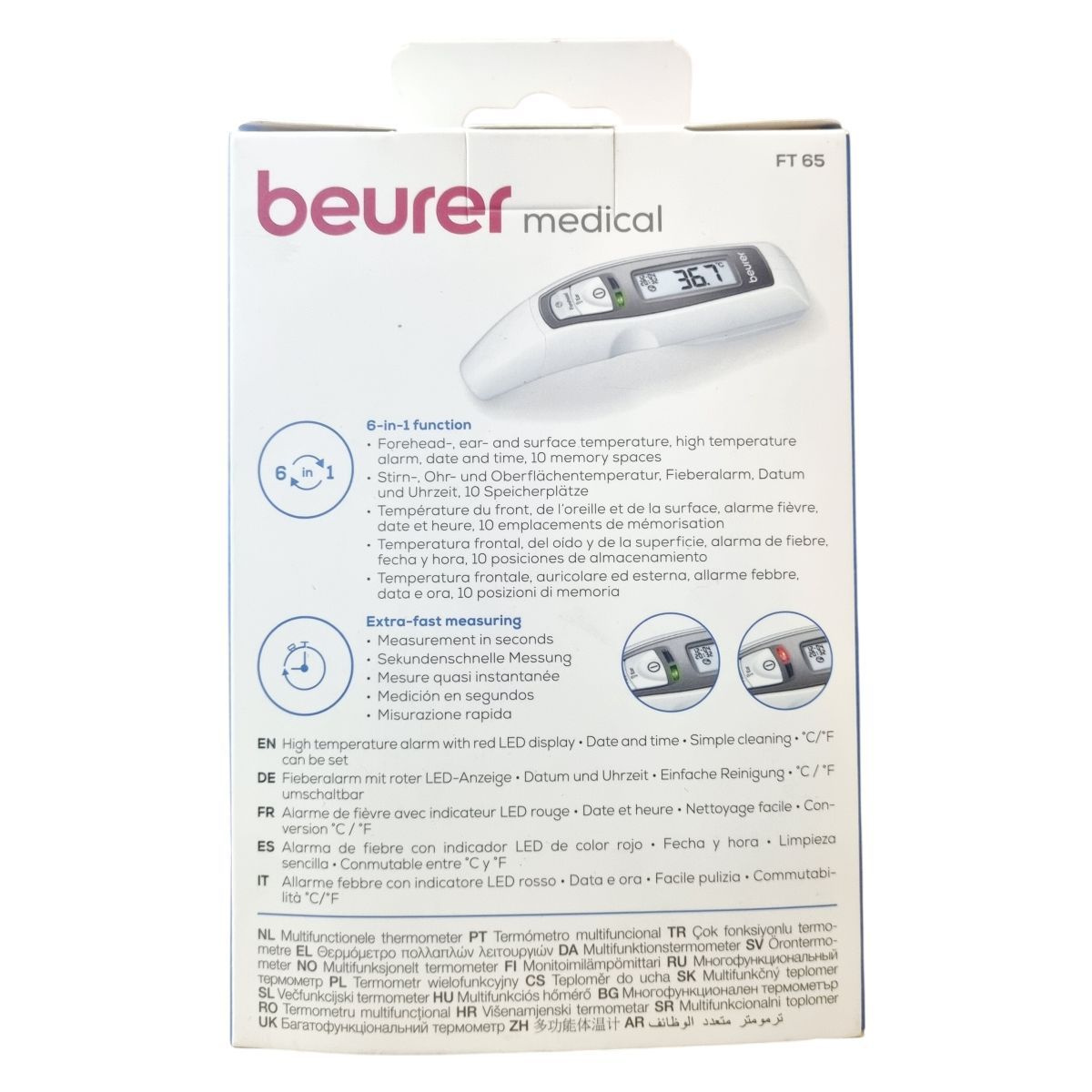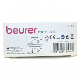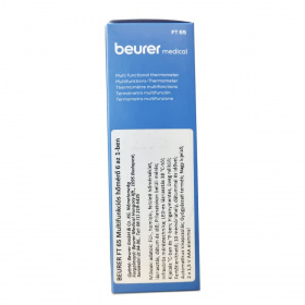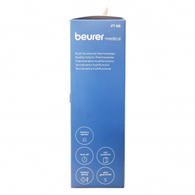 A Beurer FT 65 egy hat az egyben multifunkciós hőmérő, amely infravörös méréstechnológiát alkalmazva pillanatok alatt mér homlok-, fül- és felületi hőmérsékletet. A készülék lázriasztással rendelkezik, amely 38 °C-tól vörös LED fényjelzéssel figyelmeztet. A nagy kijelzőn megjelenik a mérési eredmény, a dátum és az idő, így a mérések könnyen nyomon követhetők a 10 memóriahelynek köszönhetően. A hőmérő higanymentes és üveg nélküli, ezért biztonságosan használható, fertőtleníthető, valamint az automatikus kikapcsolás segíti az elemkímélést. A működési hőmérséklet 15 °C és 35 °C között van, az elemek 2 db 1,5 V AAA típusú akkumulátor. A műszer orvosi eszköznek minősül, és német mérnöki pontossággal készült.