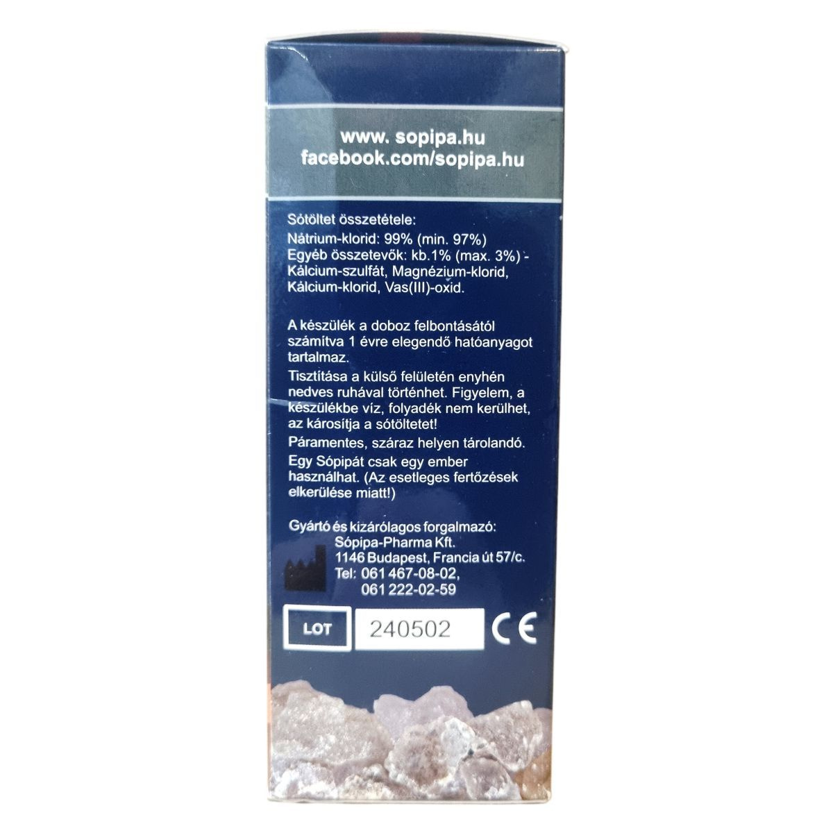 A Sópipa2® segíthet légúti megbetegedések, mint az asztma, COPD, légúti allergiák, hörghurut, valamint dohányzásról való leszokás után a légutak regenerációjában és légúti fertőzések esetén. A termék természetes kősóból készül, amely a sóbarlangok légkörének előnyeit nyújtja otthon is. A belélegzett sókristályok serkentik a légutak tisztulását és a természetes öntisztító folyamatokat. A kezelés segíti a nehezen kiürülő légúti váladék könnyebb távozását köhögéssel és orrfolyással, így gyorsíthatja a tünetek enyhülését és hozzájárulhat a megelőzéshez is. A sótöltet a doboz felbontásától számított egy évre elegendő hatóanyagot tartalmaz. A készüléket csak a külső felületén enyhén nedves ruhával szabad tisztítani.