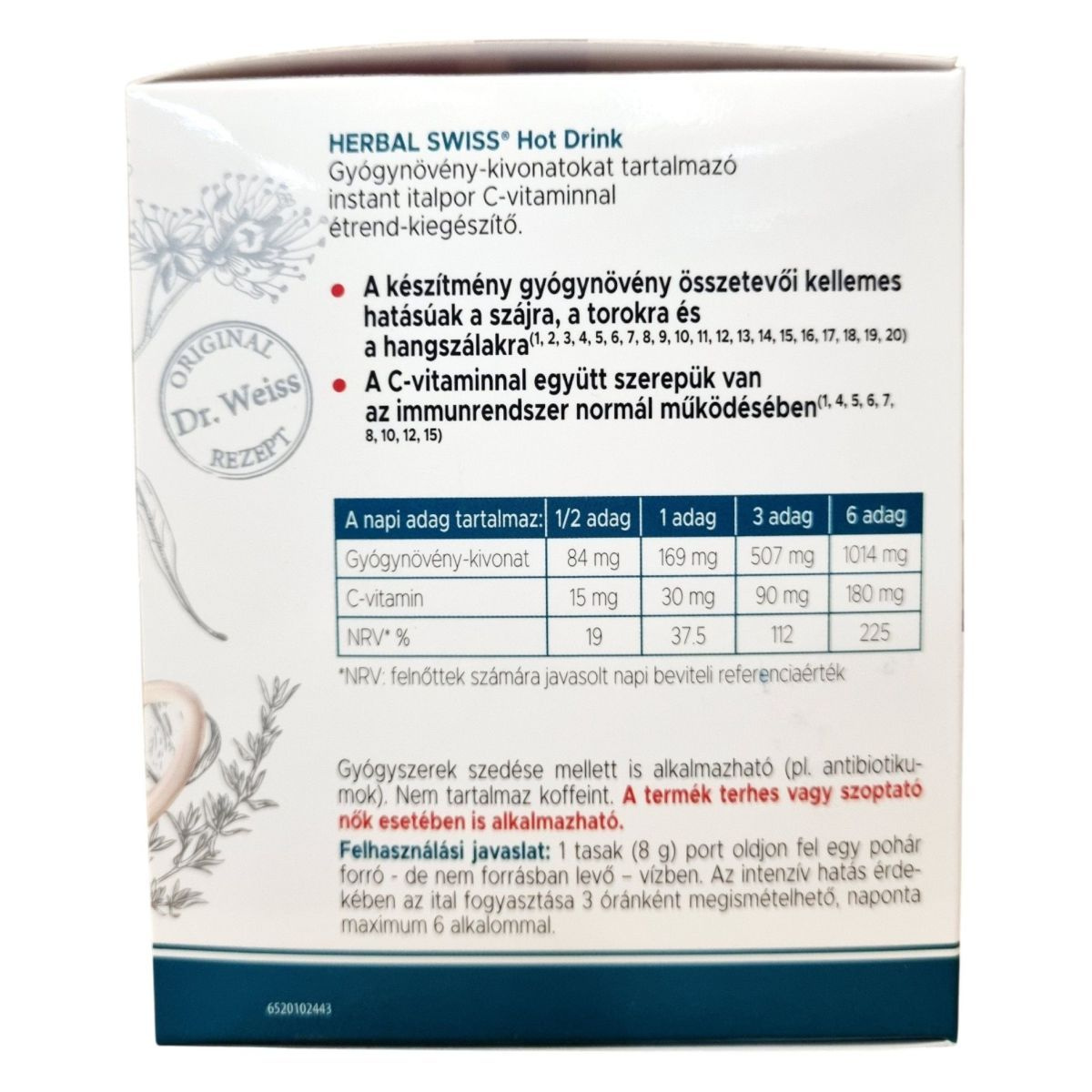 6 adag: 1014 mg gyógynövény-kivonat, 180 mg C-vitamin (NRV 225%)