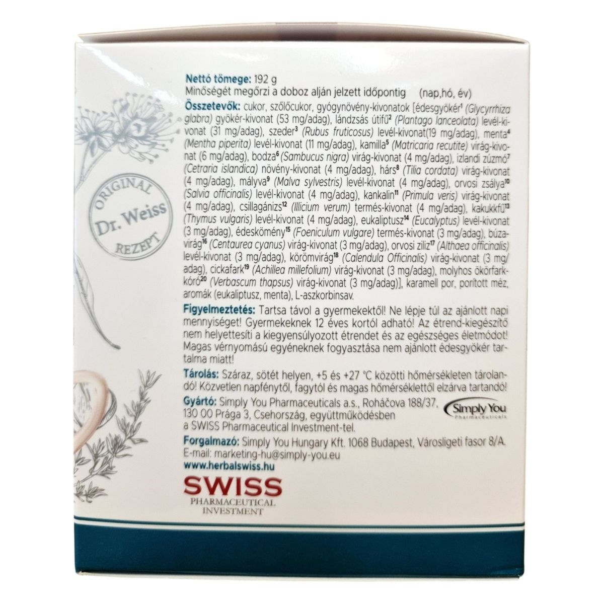1 adag: 169 mg gyógynövény-kivonat, 30 mg C-vitamin (NRV 37,5%)