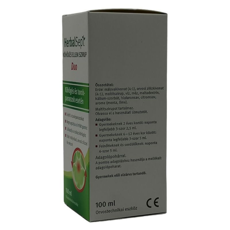 Mire kell figyelni az alkalmazás előtt? Ez az orvostechnikai eszköz maltitszirupot tartalmaz. Amennyiben Ön érzékeny a maltitolra vagy a szorbitolra, akkor a HerbalSept Köhögés elleni szirup Duo alkalmazása előtt konzultáljon orvosával. A kalóriaérték 1,4kcal/g. A HerbalSept Köhögés elleni szirup DUO maltitszirupot és maltodextrint tartalmaz, és enyhén hashajtó hatású lehet. Figyelmeztetés: A kálium-szorbát helyi nyálkahártya-irritációt okozhat.