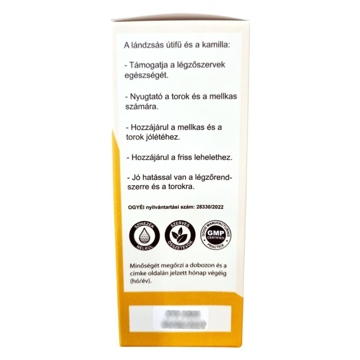 Ez a szirup kamilla és kakukkfű kivonattal, valamint mézzel készült, és 100% alkoholmentes. Gyerekeknek és felnőtteknek egyaránt ajánlott, és hozzájárulhat a légzőszervek egészségéhez, valamint nyugtató hatással lehet a torokra és a mellkasra.