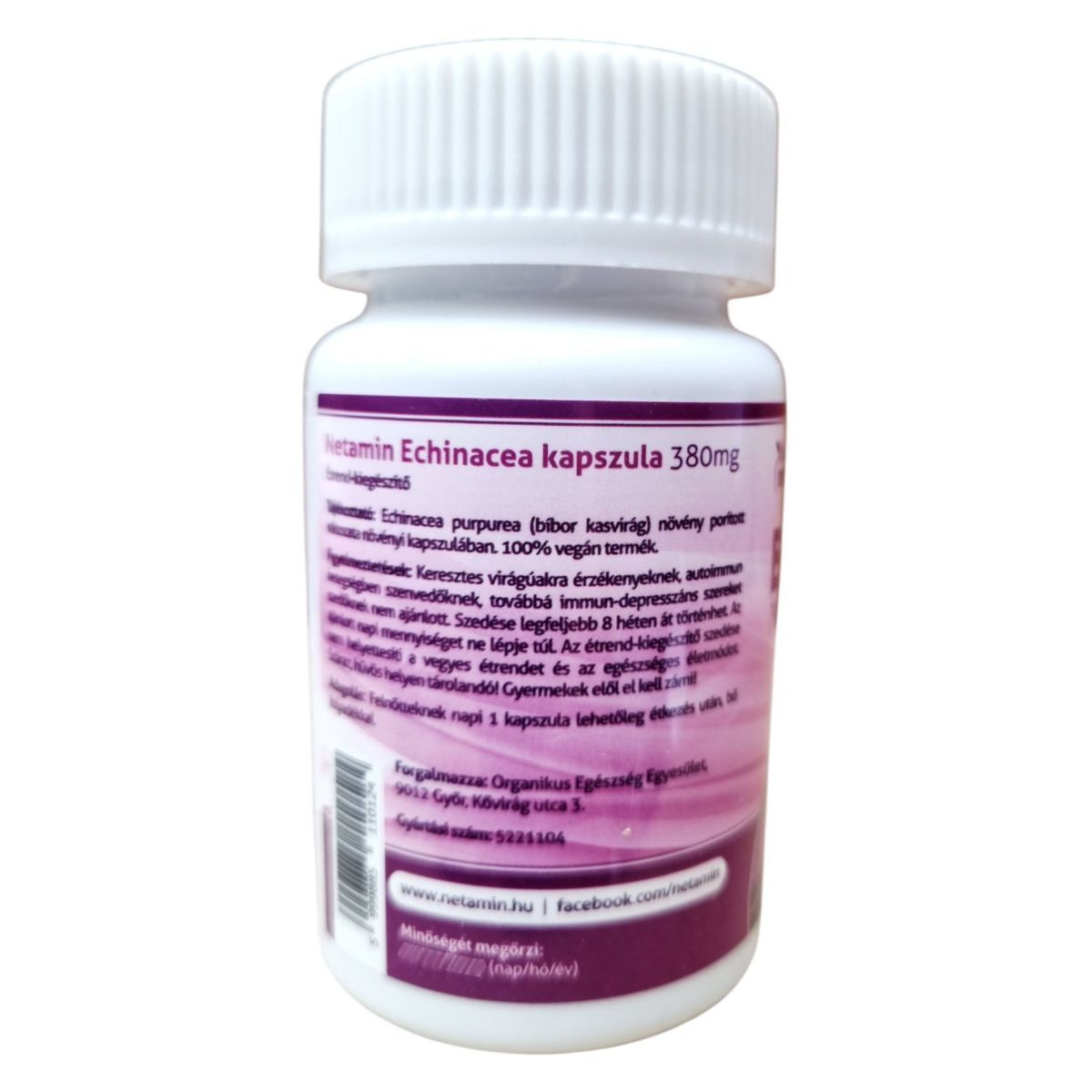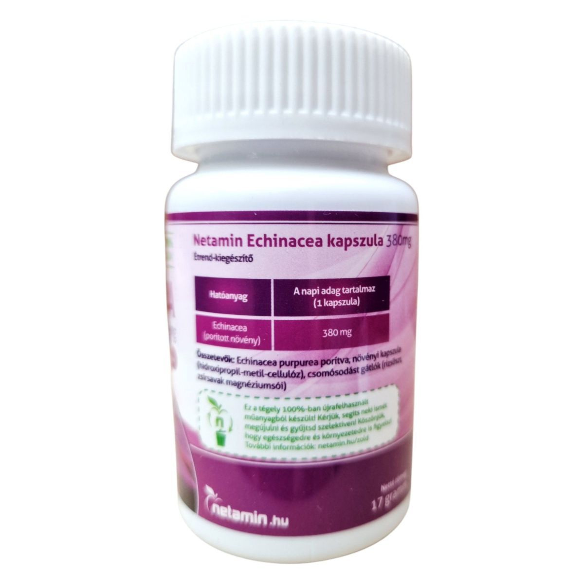 A Netamin Echinacea kapszula 380 mg porított bíbor kasvirágot tartalmaz, amelyet a természetes immunrendszer támogatására fejlesztettek ki. A termék 100% vegán, és környezetbarát, újrahasznosított műanyag csomagolásban érkezik. A kapszula könnyen fogyasztható, és napi egy kapszula elegendő a kívánt hatás eléréséhez. Kérjük, ügyeljen a termék tárolására és a figyelmeztetések betartására.