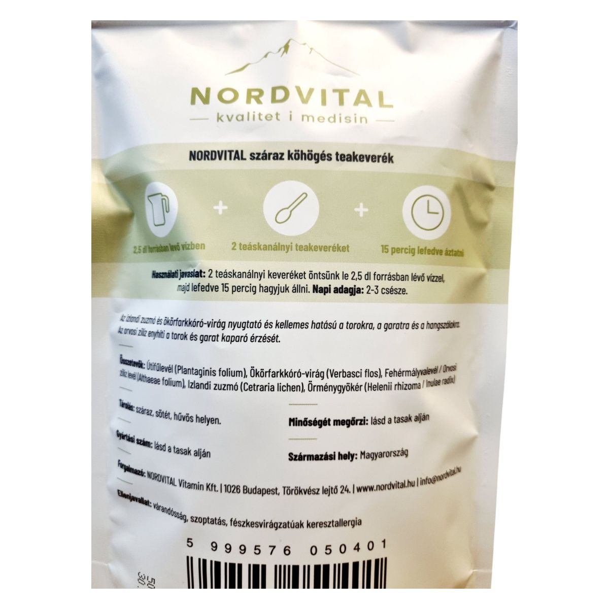 A NORDVITAL Nyugodt tüdő száraz köhögés teakeverék 100% natúr gyógynövényekből készülhet, és kellemes hatású lehet a torokra, a garatra és a hangszálakra. Az izlandi zuzmó és ökörfarkkóró-virág nyugtató hatású lehet, míg az orvosi zilíz enyhítheti a torok kaparó érzését. A termék Magyarországon készül, és a forgalmazója a NORDVITAL Vitamin Kft. Tárolása száraz, sötét, hűvös helyen ajánlott. A termék használata ellenjavallt várandósság, szoptatás alatt, valamint fészkesvirágzatúak keresztallergia esetén.