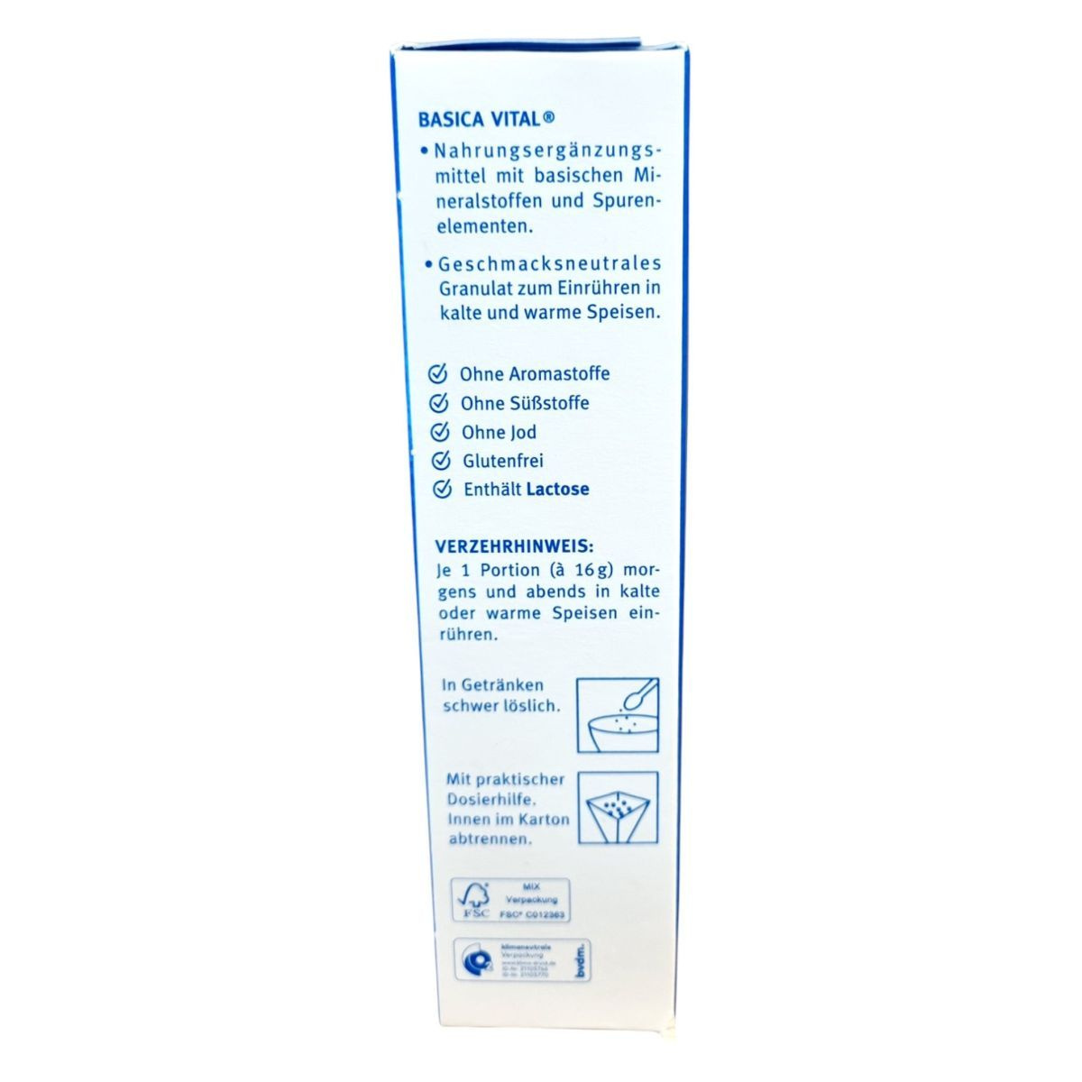 A Basica Vital egy bázikus ásványi anyagokat és nyomelemeket tartalmazó étrend-kiegészítő granulátum, amelyet hideg vagy meleg ételekbe keverve lehet fogyasztani. A termék cinket, magnéziumot, kalciumot, vasat, rezet, krómot, molibdént és szelént tartalmaz, amelyek hozzájárulhatnak a normál sav-bázis egyensúly fenntartásához, a fáradtság csökkentéséhez, a normál szellemi működés fenntartásához, valamint a sejtek oxidatív stresszel szembeni védelméhez. A termék gluténmentes, de laktózt tartalmaz, és nem tartalmaz aromákat, édesítőszereket vagy jódot. A praktikus adagoló a doboz belső oldaláról választható le. A termék gyártója a Protina Pharm. GmbH, forgalmazója a Dr. Kocsis & Hoffmann Pharma Kft.