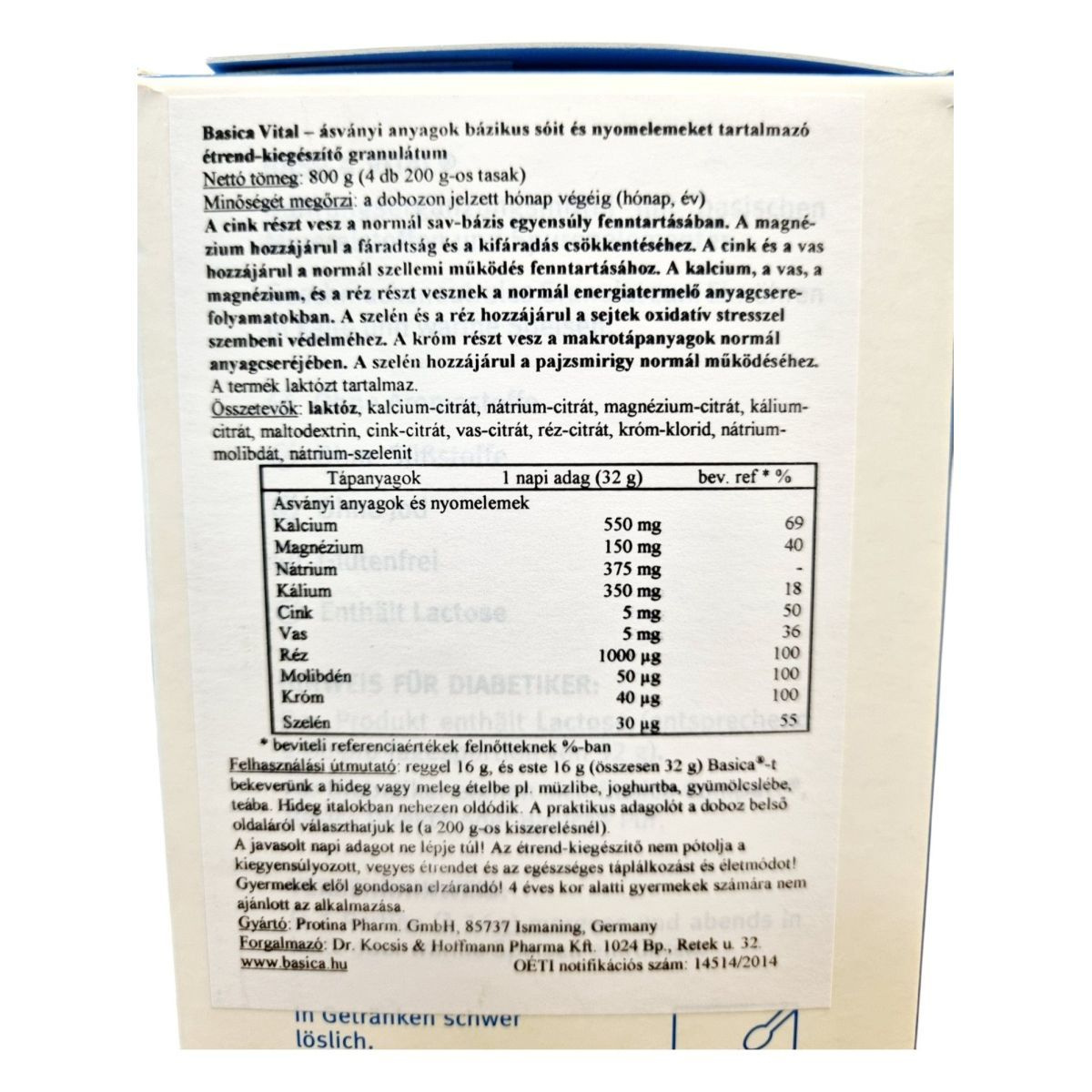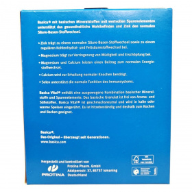 A Basica Vital étrend-kiegészítő granulátum bázikus ásványi anyagokat és nyomelemeket tartalmaz, amelyek hozzájárulhatnak a normál sav-bázis egyensúly fenntartásához. A termék cinket, magnéziumot és szelént tartalmaz, amelyek támogathatják az immunrendszer normál működését. A granulátum íztelen, és hideg vagy meleg ételekbe keverhető. A termék laktózt tartalmaz, és nem ajánlott 4 éves kor alatti gyermekek számára. A Basica Vital granulátumot a Protina Pharm. GmbH gyártja Németországban, és a Dr. Kocsis & Hoffmann Pharma Kft. forgalmazza Magyarországon.