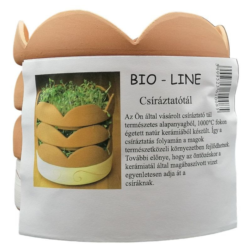 Anyaga: kerámia. A 3 db lyukacsos tál lehetővé teszi, hogy egyszerre több féle magot is csíráztathassunk. A magvakat könnyű elöblíteni: a tálcákat szétszedve, csak egyszerűen a csap alá kell rakni őket. Az alsó tál jól használható a magvak beáztatásához és a lecsepegő víz összegyűjtéséhez.