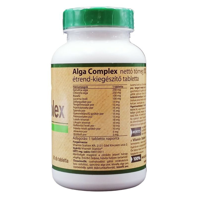 A táplálékok csúcsa! Az Alga Complex egyedülálló összetétellel rendelkezik, mivel a spirulina és chlorella algán kívül még búzafüvet, lucernát, és további 12 értékes növényi összetevőt is tartalmaz. Az Alga Complex a lúgosító, méregtelenítő kúrák fontos kiegészítője lehet.