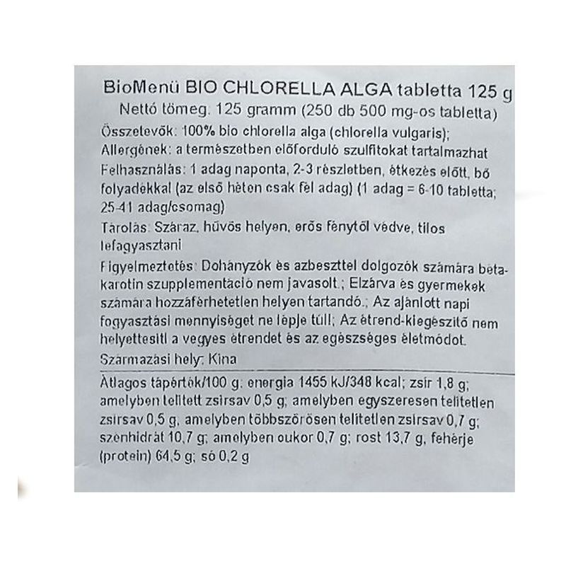 Pozitívan hat a sejtregenerálódásra, valamint a sebek gyógyulási folyamataira, erősíti továbbá a stresszel szembeni ellenálló-képességet és tompítja a testszagokat. A chlorella elsősorban a gyomor, a lép, a vastagbél, a máj, az epehólyag, a szívburok, valamint a három sugárzó energetikai pályáit harmonizálja. A chlorella: tisztítja az emésztőrendszert, elsősorban a vastagbelet, támogatja a hasznos bélmikroflóra kialakulását, javítja a bélműködést. Támogatja a szervezet természetes ellenálló-képességét. Megtisztítja a testet a mérgektől, a nehézfémektől és a kemikáliáktól. Pozitívan befolyásolja a vérképzést, és támogatja a fehérvérsejtek tevékenységét. Rendkívüli hatással van a szövetek regenerálódására. Csökkenti a máj, de a vér koleszterinszintjét is. Tisztítja a vért, éppen ezért kiválóan védi a májat és a vesét. Semlegesíti a szabad gyököket, lelassítja a szervezet öregedésének folyamatát. Fiatalító hatással bír, magas RNA (10%) és DNA (3%) tartalmának köszönhetően. Elősegíti a szervezet teljes regenerálódását. Javítja a bőr minőségét és egészségi állapotát. Minden fontos vitamin, ásványi anyag és aminosav (beleértve az esszenciális, azaz nélkülözhetetlen aminosavakat is) megtalálható benne. Nagy mennyiségben 10-23%-ban tartalmaz CGF-t (Chlorella növekedési tényező), ami a szakértők szerint a Chlorella leghatékonyabb összetevője is egyben. Chlorella használata: az értékes nutritív anyagoknak köszönhetően a Chlorella kiváló, mindennap szedhető táplálék-kiegészítő készítmény. Használata minden redukciós diéta, esetleg vegetáriánus életmód esetében ideális. A gyerekeknél pozitívan hat a megfelelő táplálkozási szokások kialakításakor. Hathatós segítséget nyújthat akné, kiütések, gyulladások, ekcéma, de nehezen gyógyuló felületi sebek vagy sérülések (leforrázás, égés, marás, stb.) gyógyításakor is. Támogatja a hosszantartó stressznek vagy terhelésnek kitett szervezet regenerálódását és lábadozását. Kiválóan alkalmazható a műtéti beavatkozás, illetve bármilyen sugárkezelés után. Javasolt felhasználás, adagolás Egy adag = 6 tabletta. Javasoljuk, hogy naponta 3x2 500mg-os tablettát vegyen be, bő vízzel. A legjobb, ha étkezés előtt fél órával teszi mindezt. Az első hetet csökkentett adaggal kezdje (3-4 tablettát), hogy a méregtelenítési tüneteket minimalizálja. Tárolás: jól zártan, száraz, hűvös helyen, gyermekek számára hozzáférhetetlen módon. Rendelet: ha Ön terhes, szoptat, beteg, vagy gyógyszereket szed, konzultáljon kezelőorvosával, mielőtt bármiféle étrend-kiegészítőt használna! Ha az orvosa nem nyitott az az étrend-kiegészítők alkalmazására, keressen fel egy természetgyógyász szakembert! Az ajánlott napi fogyasztási mennyiséget ne lépje túl! Az étrend-kiegészítő nem helyettesíti a vegyes étrendet és az egészséges életmódot.