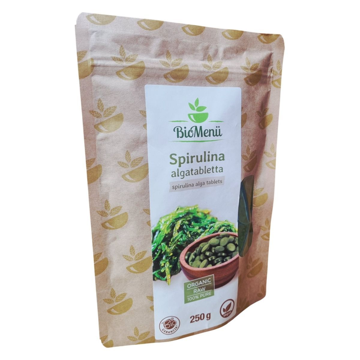 A BioMenü Spirulina algatabletta 250 g-os kiszerelésben kapható, amely 500 db 500 mg-os tablettát tartalmaz. A termék 100% bio spirulina algát tartalmaz, amely Kínából származik. A spirulina alga gazdag fehérjében és rostban, valamint alacsony zsírtartalommal rendelkezik. Az étrend-kiegészítő bio, raw és vegán minősítéssel rendelkezik, így különböző étrendi irányzatokba is beilleszthető. A termék fogyasztása során fontos, hogy az ajánlott napi mennyiséget ne lépjük túl, és tartsuk be a tárolási előírásokat. A termék minőségét a HU-ÖKO-02 tanúsítvány garantálja.