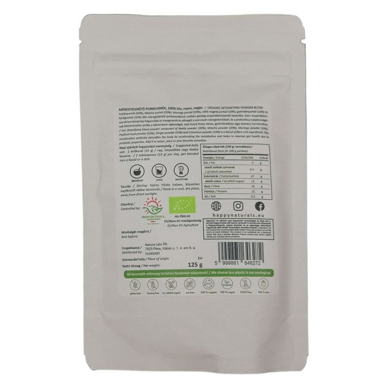 Csalánporból (30%), Matcha porból (20%), Moringa porból (20%), útifű maghéj porból (10%), gyömbérporból (10%) és fahéjporból (10%) álló méregtelenítő porkeverékünk rostban gazdag szuperélelmiszerek keveréke. Ezen szuperélelmiszerek kombinációja felgyorsítja az anyagcserét és elősegíti a szervezet méregtelenítését, és a prebiotikus tulajdonságainak köszönhetően javítja a bélrendszer egészségét. Add hozzá tiszta vízhez, gyümölcsléhez vagy kedvenc turmixodhoz.