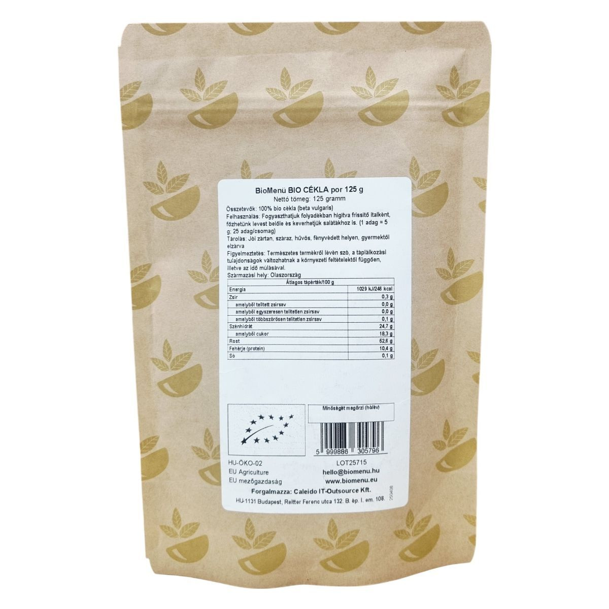 A BioMenü BIO Cékla por Olaszországban készül, 100%-ban bio összetevőből, egy tiszta, nyers növényi alapú termék, amely számos módon felhasználható, például hígítva fogyasztva frissítő italként, levesként vagy salátákhoz keverve. Vegán, bio és nyers étrendbe egyaránt illeszthető. Fontos a termék megfelelő tárolása, így hosszabb ideig megőrzi minőségét. Az átlagos tápértékek alapján tápláló és természetes összetevője lehet az étrendnek.
