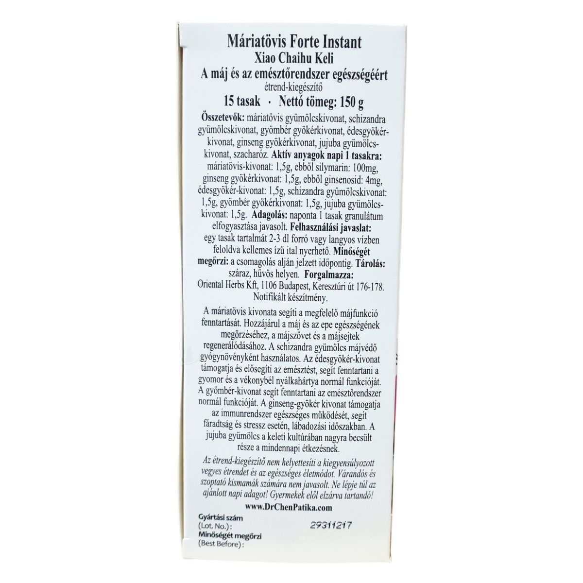A termék hatóanyagai között szerepel a máriatövis-kivonat, amely segítheti a megfelelő májfunkció fenntartását, hozzájárulhat a máj és az epe egészségének megőrzéséhez, valamint a májsejtek regenerálódásához. A schizandra gyümölcs májvédő gyógynövényként ismert, míg az édesgyökér-kivonat támogathatja az emésztést és segítheti a gyomor és a vékonybél nyálkahártyájának normál működését. A gyömbér-kivonat hozzájárulhat az emésztőrendszer normál működéséhez. A ginseng gyökérkivonat támogathatja az immunrendszer egészséges működését, és segítséget nyújthat fáradtság, stressz vagy lábadozási időszak esetén. A jujuba gyümölcs a keleti kultúrákban értékelt része a mindennapi táplálkozásnak. A készítmény aromazáró csomagolásban érkezik, mely megőrzi az összetevők frissességét, és könnyen elkészíthető, kellemes ízű italként fogyasztható. Nem helyettesíti a kiegyensúlyozott étrendet és az egészséges életmódot.