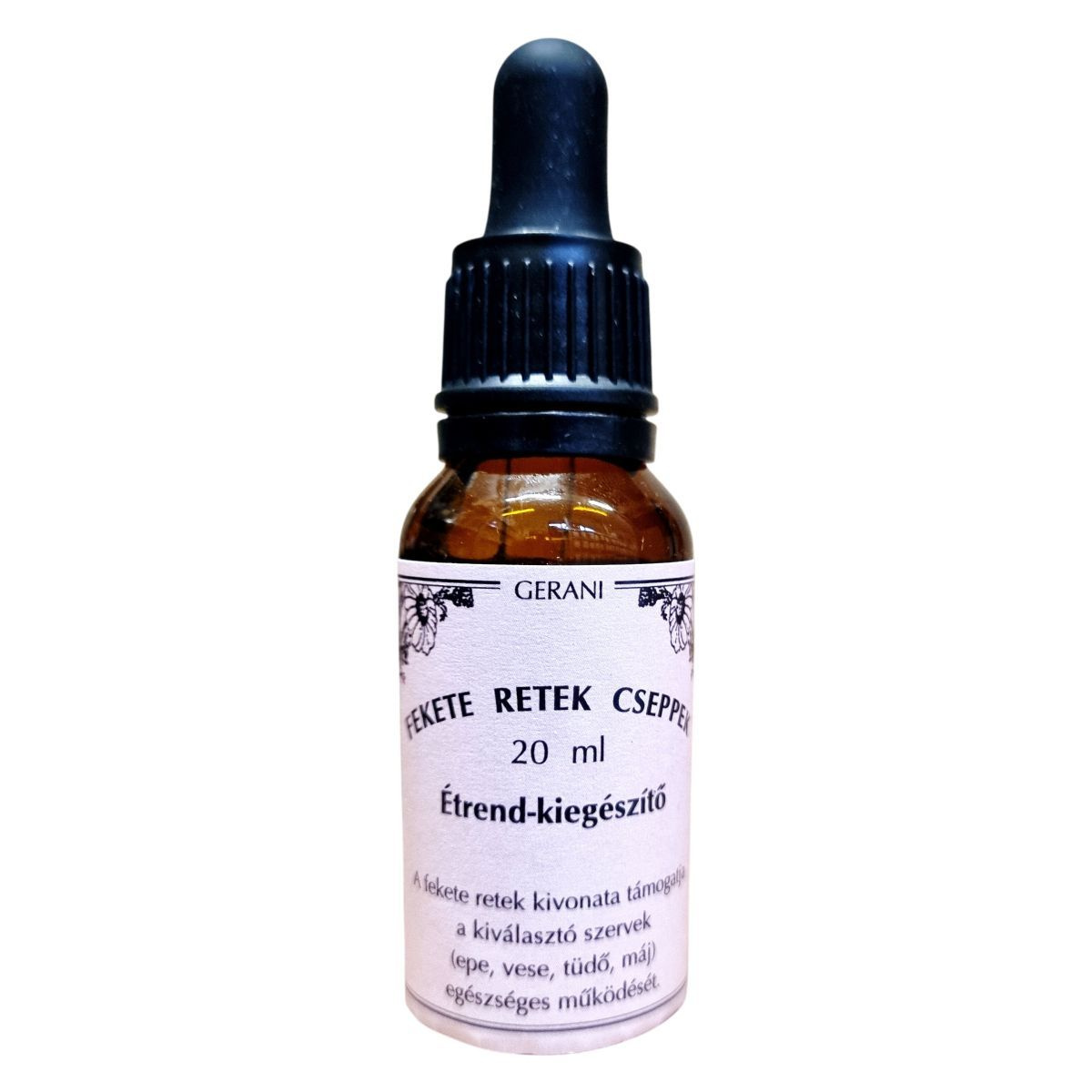 A Gerani Fekete Retek Cseppek egy étrend-kiegészítő, amely a fekete retek gumójának vizes alkoholos kivonatát tartalmazza. Az alkohol tartalma 1,8 % v/v. A termék napi adagja 1714 mg, amely megfelel 17,1 g friss fekete retek gumónak vagy 12,8 g friss retek préslének. A fekete retek kivonata támogathatja a kiválasztó szervek, mint az epe, vese, tüdő és máj egészséges működését. A terméket napfénytől védve, gyermekektől elzárva, szobahőmérsékleten kell tárolni. A gyártó és forgalmazó a Gerani Rel Kft., és a termék OÉTI engedélyszáma 10038/2011.