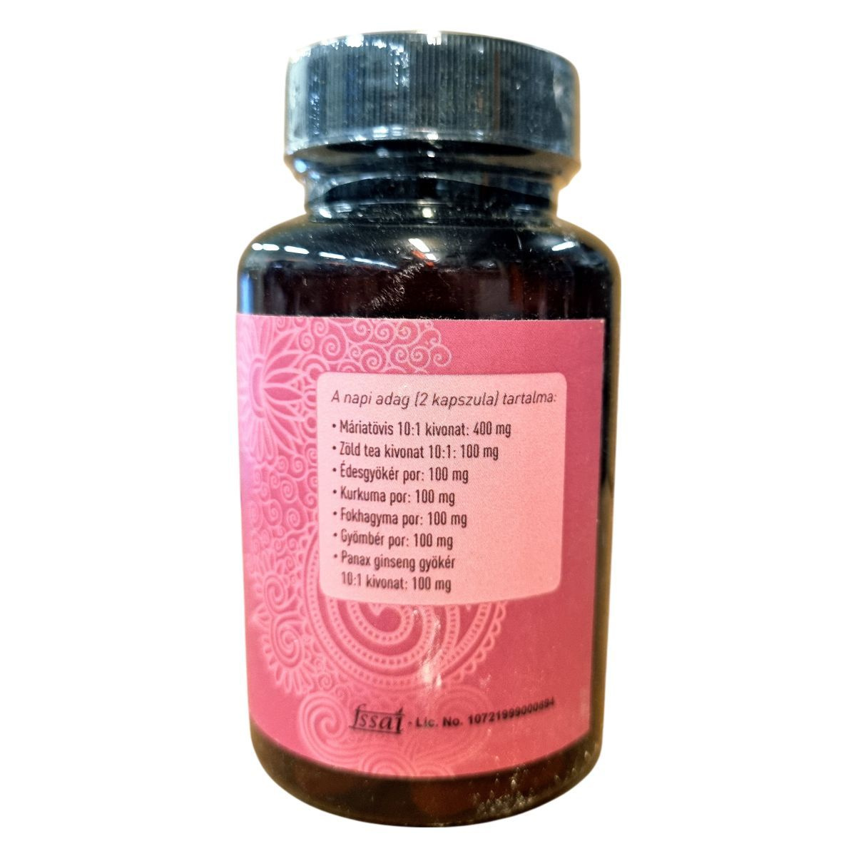 máriatövis kivonat, zöld tea kivonat, édesgyökér por, kurkuma por, fokhagyma por, gyömbér por, ginzeng kivonat, növényi cellulóz (kapszula)