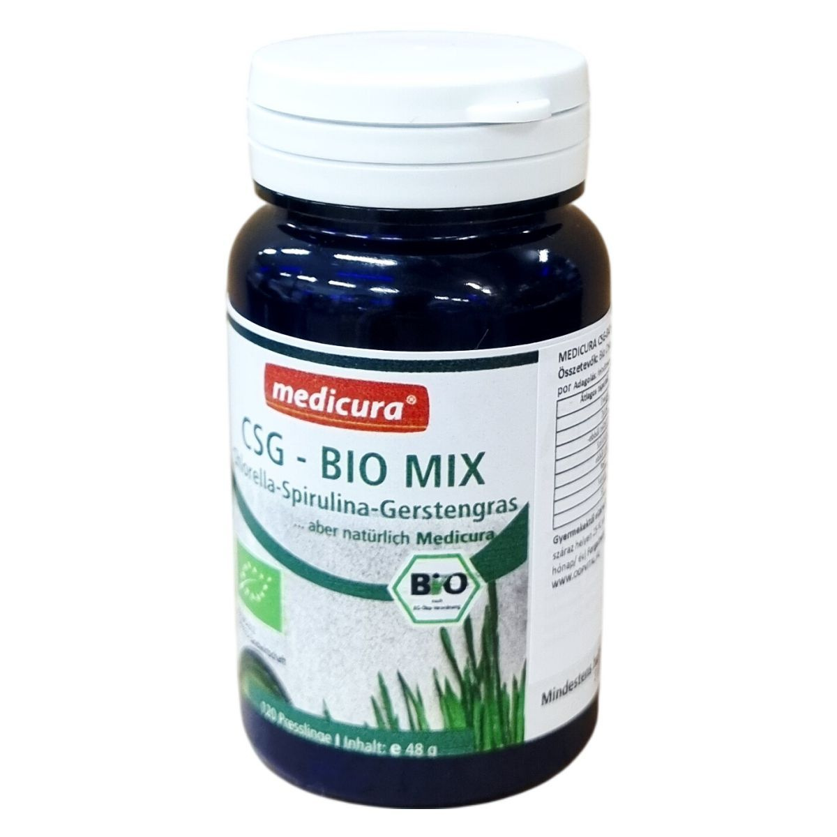 CSG - BIO MIX. Bio chlorella, bio spirulina és bio zöldárpafű keveréke. 120 préselt tabletta, nettó tömeg: ℮ 48 g. Nem EU mezőgazdaság. C = Bio Chlorella, S = Bio Spirulina, G = Bio Zöldárpafű. Minőségét megőrzi: a dobozon feltüntetett ideig (nap/hónap/év).
