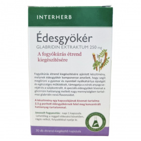 Az INTERHERB Édesgyökér Glabridin Extraktum 250 mg kapszula egy speciális étrend-kiegészítő, amely a fogyókúrás étrend kiegészítésére ajánlott. A termék édesgyökér komponense segíthet megőrizni a gyomor és nyombél nyálkahártya épségét, valamint támogathatja a zsírok anyagcseréjét és a súlykontrollt. A kapszula koncentrált hatóanyag-tartalommal rendelkezik, amely 2,5 g porított édesgyökérnek felel meg. A megbízható minőséget a koncentrált extraktum, a bevizsgált alapanyag és a hazai fejlesztés garantálja.
