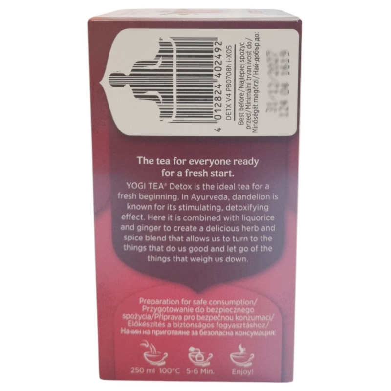A Yogi Tea Detox egy 100%-ban bio és vegán gyógynövénytea, melynek alapját az édesgyökér, gyermekláncfű, fahéj és gyömbér adja. Az ayurvédikus receptúra segíti a szervezet megtisztulását, és támogatja a testi-lelki egyensúlyt. A tea harmonikus ízvilága tökéletes választás lehet az újrakezdéshez és a mindennapi méregtelenítő rutin kiegészítéséhez. A termék koffeinmentes, így a nap bármely szakaszában fogyasztható.