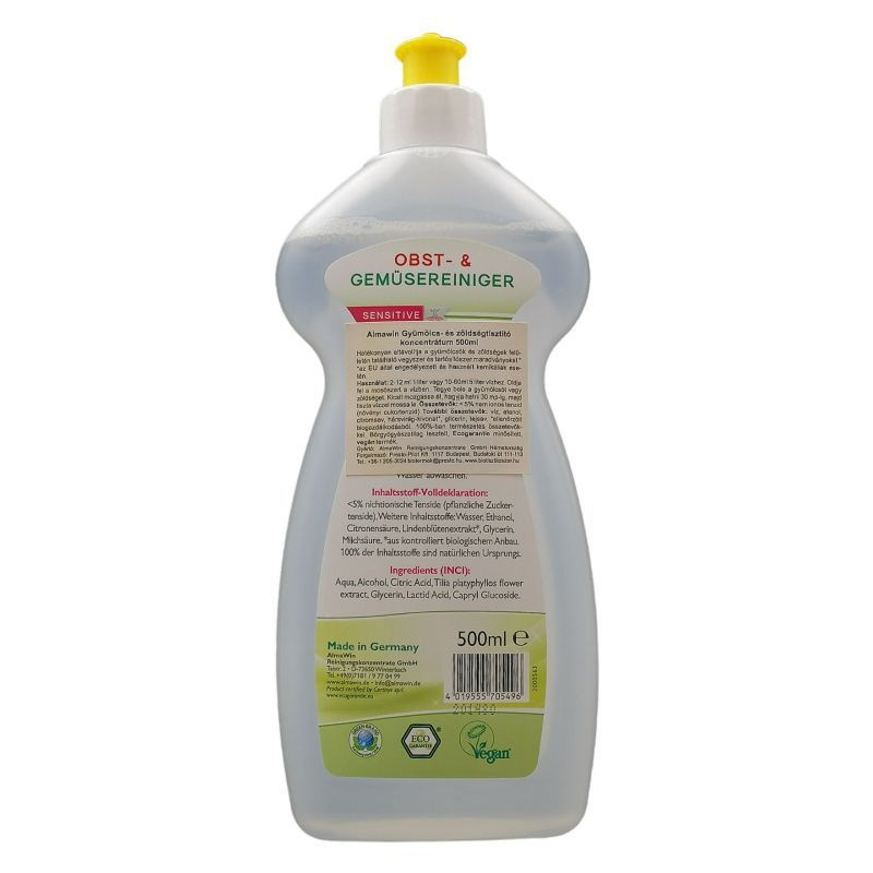 100%-ban természetes összetevőkkel. Használata: 2-12 ml 1 liter vagy 10-60 ml 5 liter vízhez. Oldja fel a mosószert a vízben. Tegye bele a gyümölcsöt vagy zöldséget. Kicsit mozgassa át, hagyja hatni 30 mp-ig, majd tiszta vízzel mossa le. Összetevők: <5% nem ionos tenzid (növényi cukortenzid), további összetevők: víz, etanol, citromsav, hársvirág-kivonat (ellenőrzött biogazdálkodásból), glicerin, tejsav.