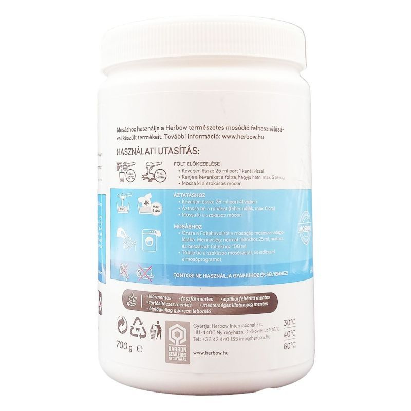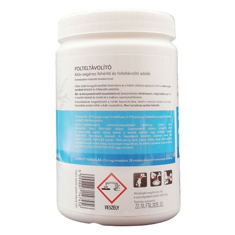 Az erősebben szennyezett textíliák fehérítésére és a foltok eltávolítására ajánljuk. Bőr- és környezetkímélő összetételének és aktív oxigénes koncentrált hatóanyag tartalmának köszönhetően nagyobb mennyiségben adagolva sem károsítja a textíliát. Használatával megelőzhető a ruhák beszürkülése. Ideális mosódió tartamú termékek használata esetén fehér ruhák mosásához. Nem tartalmaz optikai fehérítőt. 30-40-60 Celsius-fokon gépi és kézi mosáshoz is felhasználható.