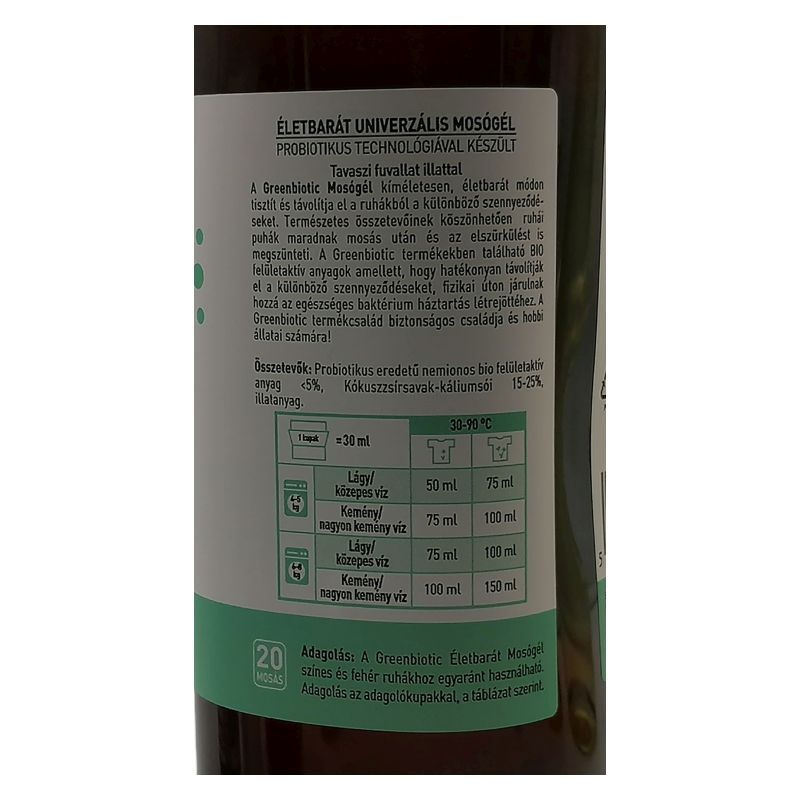 Összetevők: Probiotikus eredetű nemionos bio felületaktív anyag <5%, kókuszzsírsavak-káliumsói 15-25%, illatanyag.