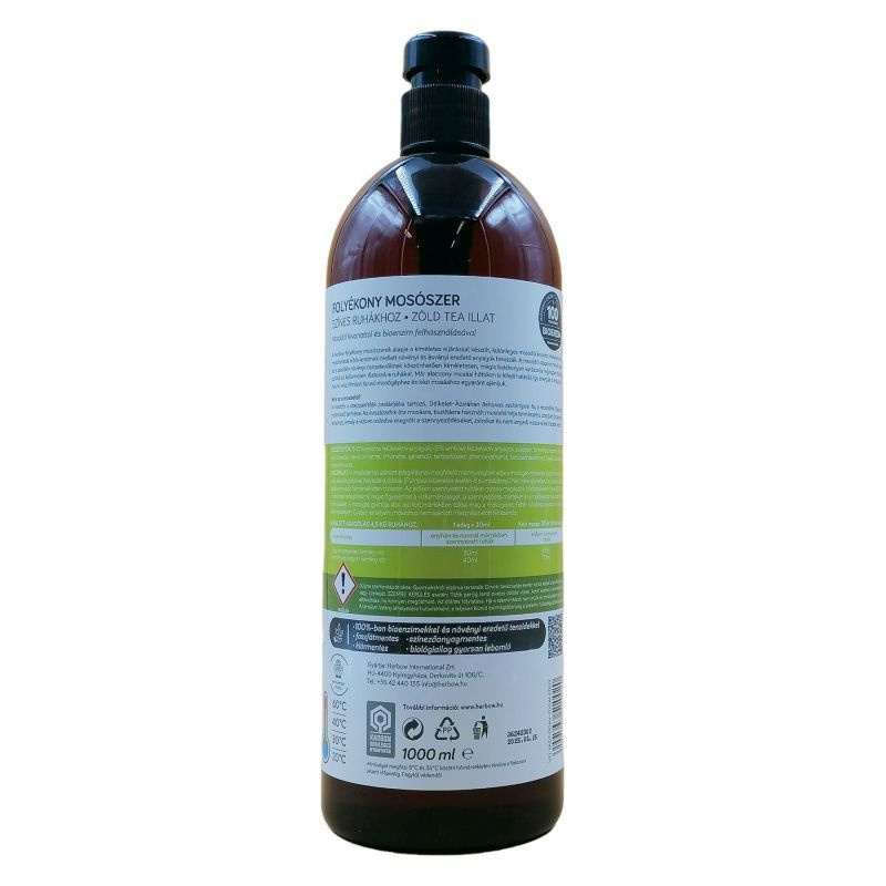 Folyékony mosószer színes ruhákhoz zöld tea illattal. Kimagasló mosóhatás növényi összetevőkkel, szövetkárosodás nélkül, 1000 ml-es kiszerelés: 33 mosásra elegendő. Prémium csomagolás, pumpás adagolóval. A kíméletes, mégis hatékony növényi összetevőknek köszönhetően a pamutpólókat, ingeket és enyhén szennyezett zoknikat már 30-40 °C fokon moshatjuk.