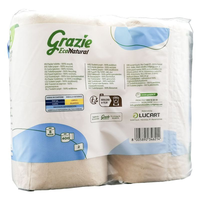 A Grazie Natural papírtermékek öko technológiával, Tetra Pak ital és élelmiszer dobozokból, átlagosan 74% karton vagy cellulóz szálakból, 22% polietilénből és 4% alumíniumból készülnek.