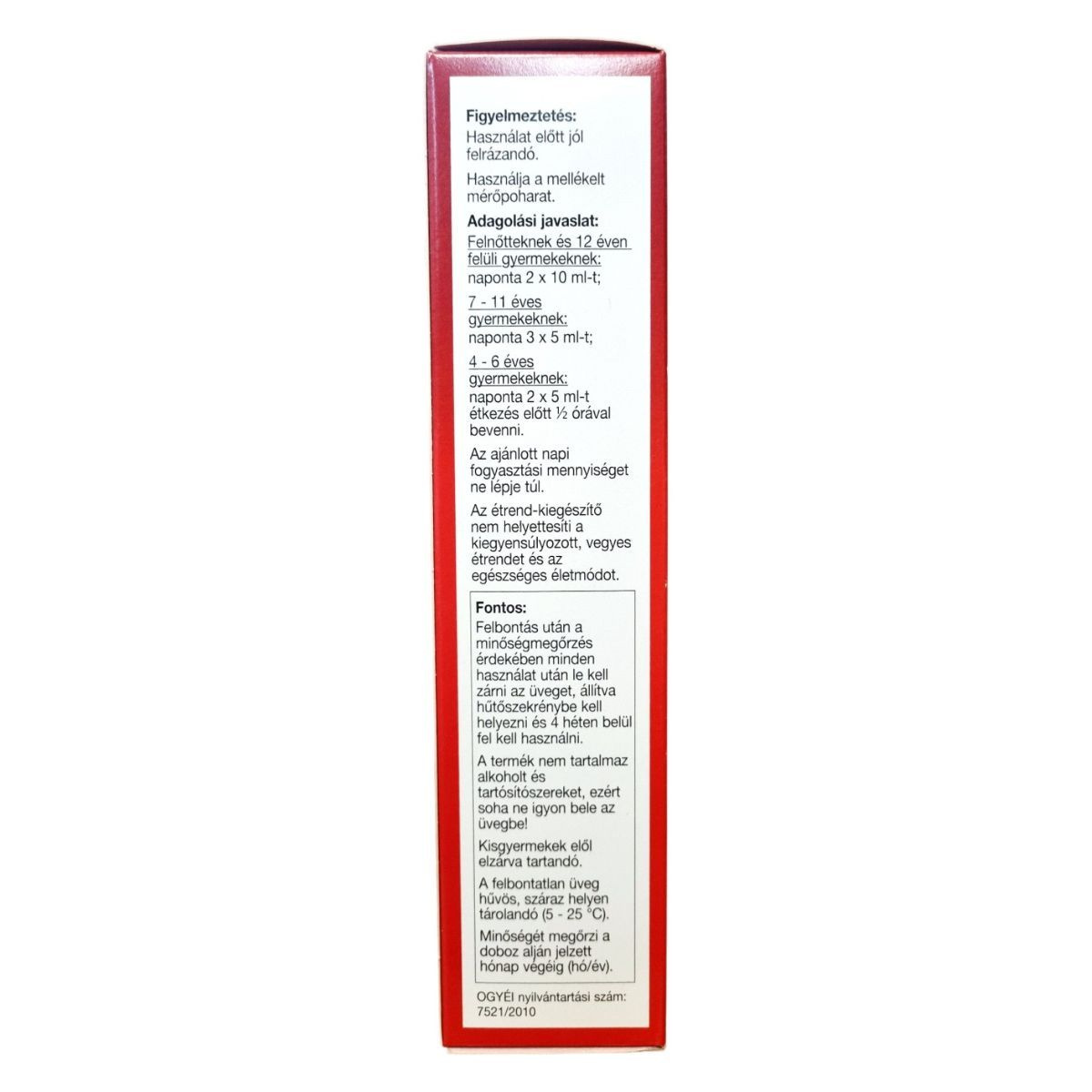 Az ajánlott napi mennyiséget ne lépje túl! Az étrend-kiegészítő nem helyettesíti a kiegyensúlyozott étrendet és az egészséges életmódot. Használat előtt jól felrázandó. A termék alkoholt és tartósítószert nem tartalmaz – ne igyon bele az üvegbe! Gyermekek elől elzárva tartandó.