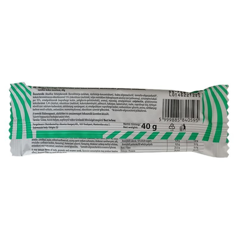 Miért különleges az AbsoBAR ZERO? Vegán, glutén és laktózmentes: a speciális étrenddel rendelkezők is fogyaszthatják. Kiváló minőségű alapanyagokból készül: rizs- és borsóprotein felhasználásával. Teljes értékű fehérjeforrás: komplettált fehérjéből (tartalmaz minden aminosavat, amelyek a a szervezet számára nélkülözhetetlenek). Tartósítószer mentes: felesleges adalékagyagoktól mentes szelet. Minimum 27% vegán proteint tartalmaz: szuper harapnivaló, ha edzés előtt/alatt/után rád tör az éhség, vagy csak ennél valami finomat. Alacsony a cukortartalma: egy szelet kevesebb, mint 2 g cukrot tartalmaz. Rostban gazdag: a megfelelő mennyiségű rostbevitel fontos a jól működő emésztéshez, és teltségérzetet is biztosít.