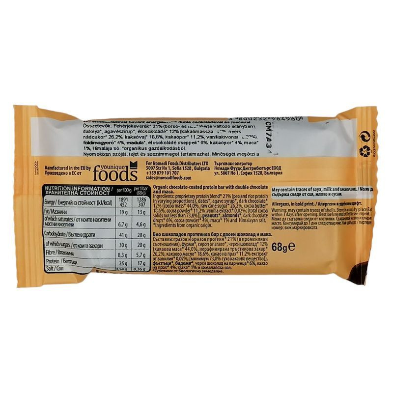 Összetevők: Fehérjekeverék* 21% (borsó- és rizsfehérje változó arányban), datolya*, agavészirup*, étcsokoládé* 12% (kakaómassza* 44%, nyers nádcukor* 26,2%, kakaóvaj* 18,6%, kakaópor* 11,2%, vaníliakivonat* 0,02%), földimogyoró* 4%, madula*, étcsokoládé cseppek* 6%, kakaópor* 4%, maca* 1%, Himalája só. *organikus gazdálkodásból.